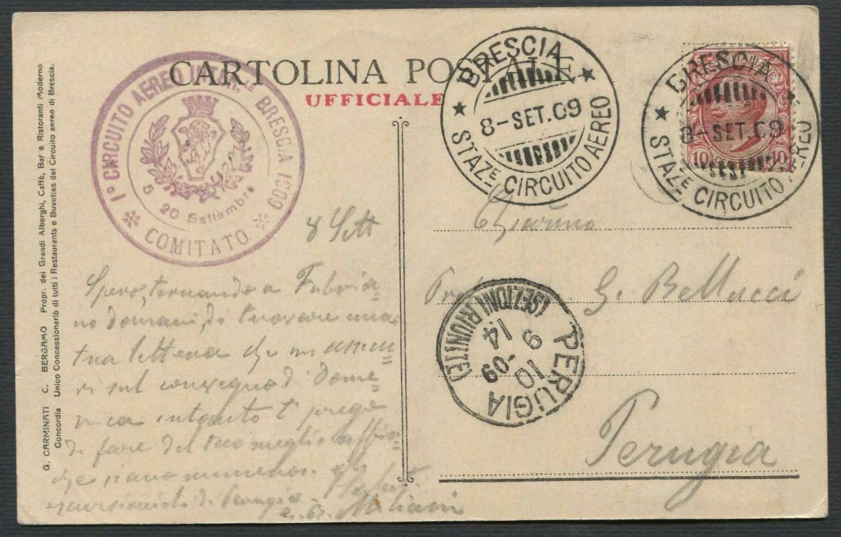 recante il bollo speciale "Brescia/Staz. Circuito Aereo/ 8-sett 09 *Comitato*" da 37 mm. (Longhi 09ALa + 09ALd). Francobollo con difetti ma di eccellente aspetto, non comune.