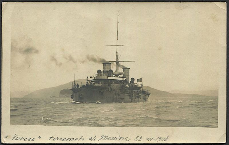 1909, cartolina fotografica che illustra la R.N. “Varese”, scritta da Messina il 10 gennaio 1909 per Modena, due settimane dopo il terribile terremoto che distrusse la città e causò la perdita di circa 100.000 persone.