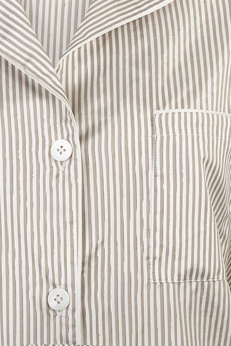 Modello Cara Gold in morbida seta jacquard tinta in filo,sapientemente tessuta a Como. Il set include una camicia di taglio maschile unita a shorts con elastico in vita.