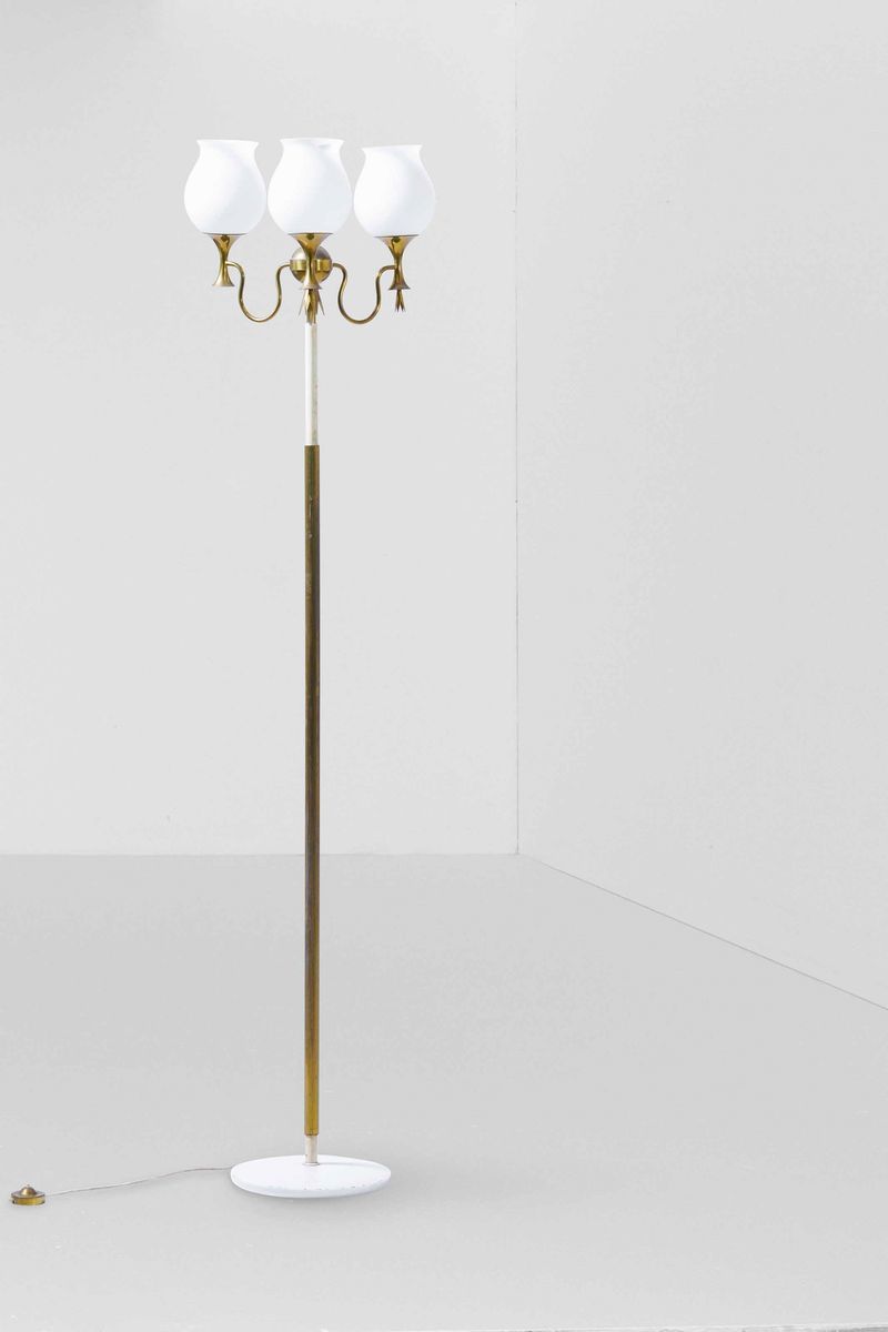 Lampada da terra con struttura in ottone e ottone laccato, diffusori in vetro duplex opal bianco.