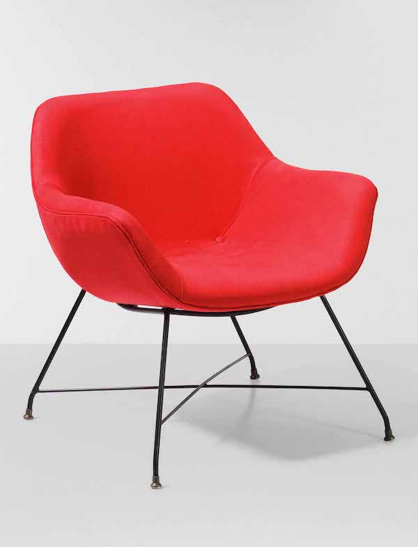 Poltrona con struttura in legno, sostegni in tondino metallico laccato e rivestimento in tessuto. Particolari in ottone. Prod. Saporiti, Italia, 1950 ca.