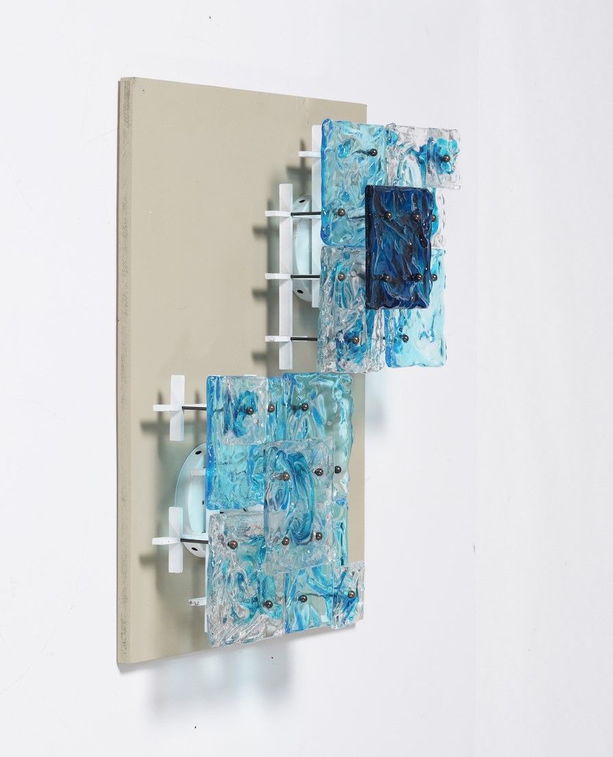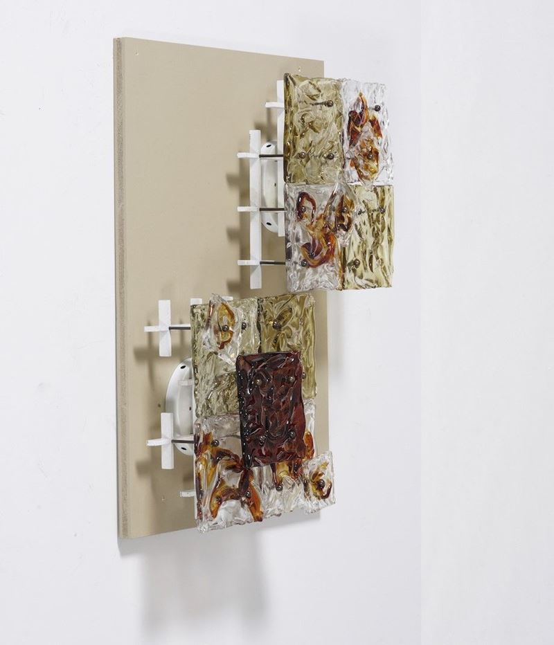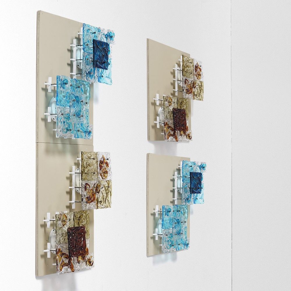 Quattro appliques mod. Patchwork. Struttura in metallo laccato, supporti in ottone e piastre in vetro di Murano lavorato a mano. Marchio originale della produzione.