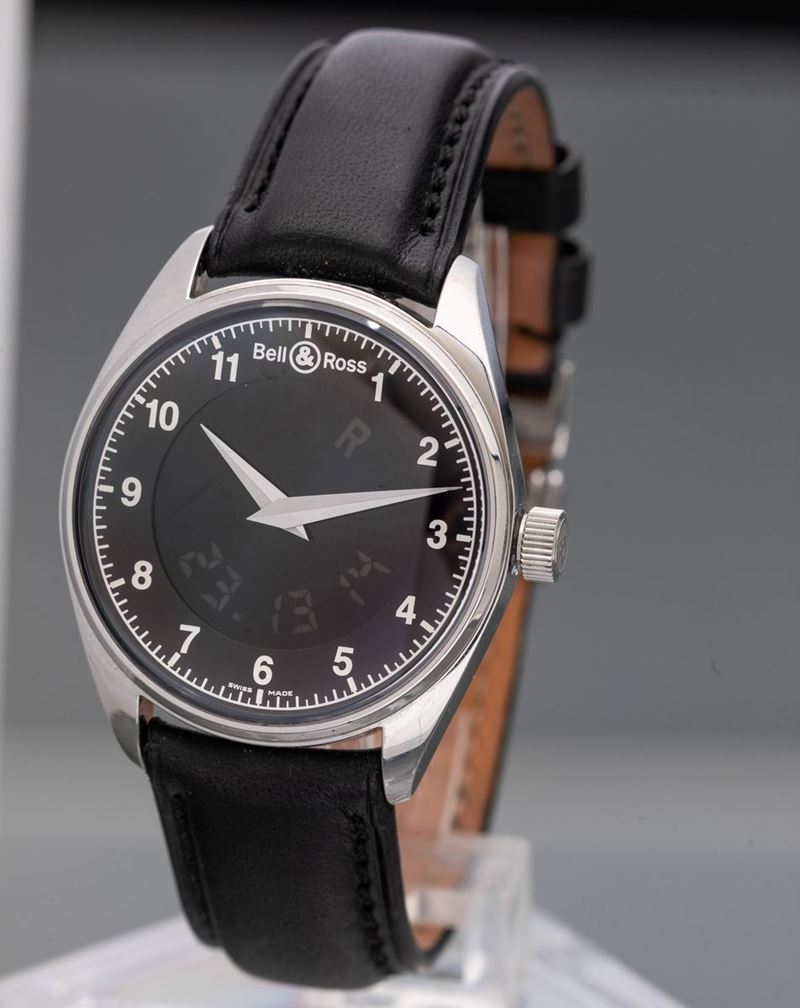 Bell & Ross Fusion in acciaio al quarzo analogico e digitale, quadrante nero con numeri Arabi con calendario.