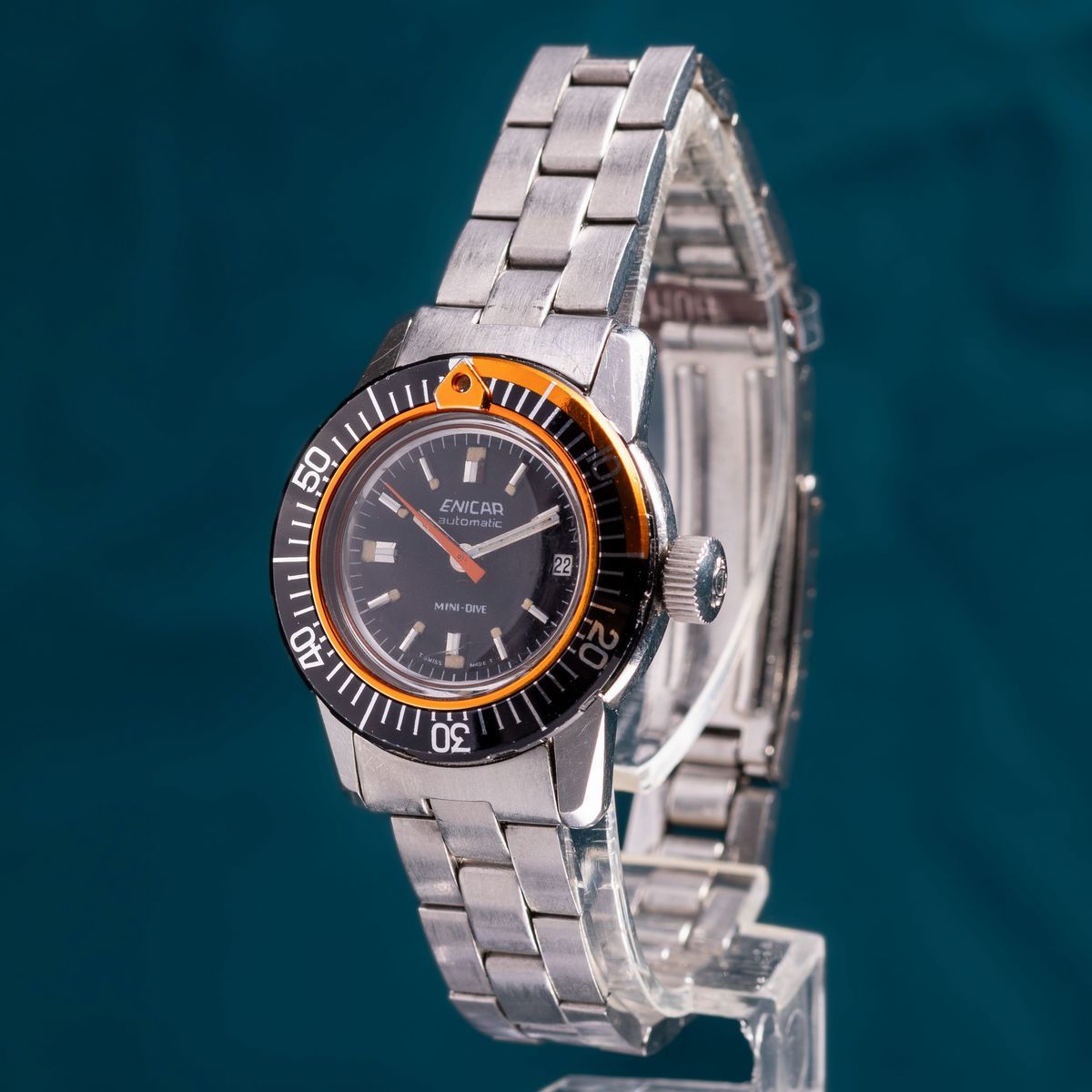 Enicar mini dive Lady in acciaio impermeabile, ghiera girevole quadrante nero al trizio con indici applicati, anni ‘70