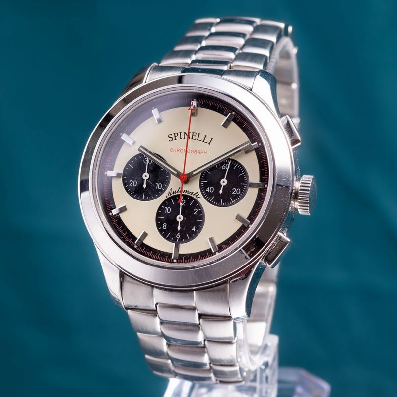 Spinelli, cronografo automatico da uomo in acciaio tre contatori quadrante “Exotic”, tasti quadri con bracciale, anni 2000.