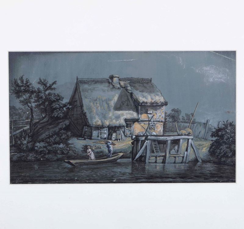 Lorenzo Scarabellotto (1796 - dopo il 1847) paesaggio fluviale con imbarcazione e casa