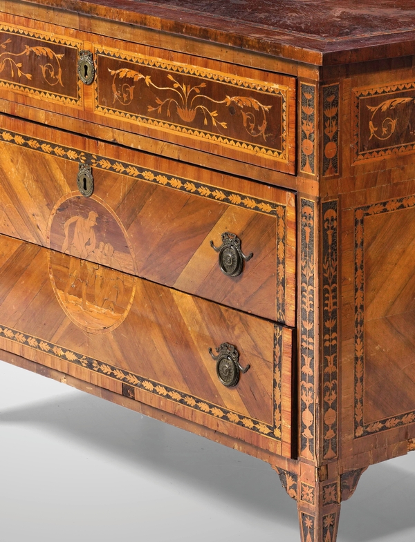 Fronte a sette cassetti e un'anta, decoro a riserve dorate centrate da motivi vegetali e paesaggi