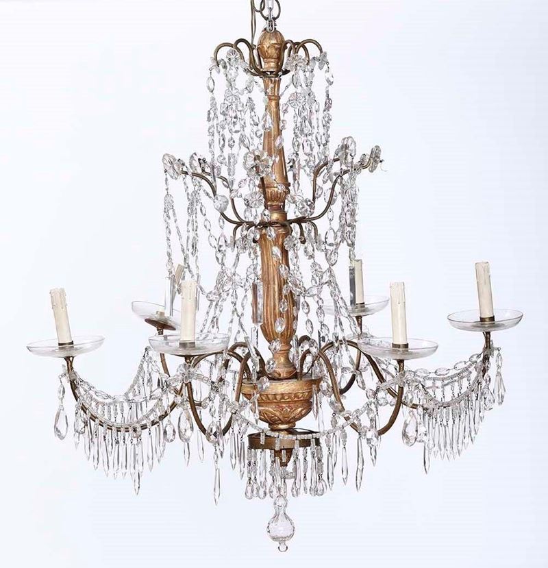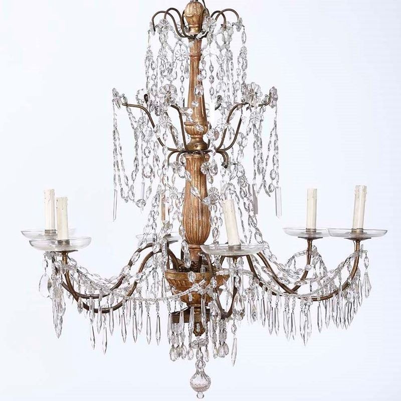 Coppia di lampadari Luigi XVI in legno intagliato, dorato e cristalli. Genova XVIII-XIX secolo