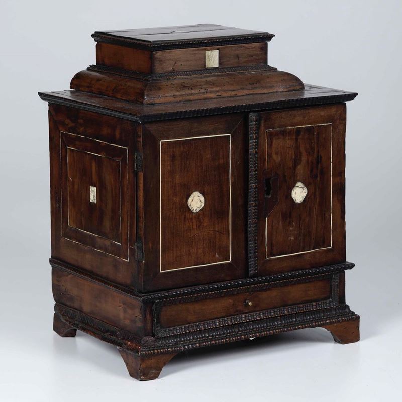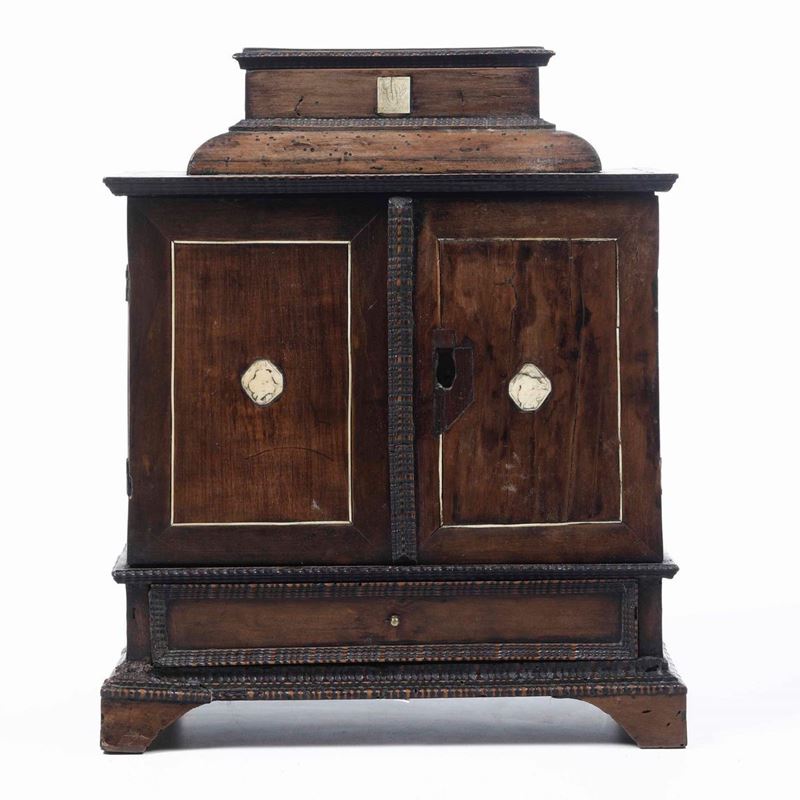 Due ante celanti cassettini lastronati in tartaruga, quello centrale decorato a nicchia con putto dorato