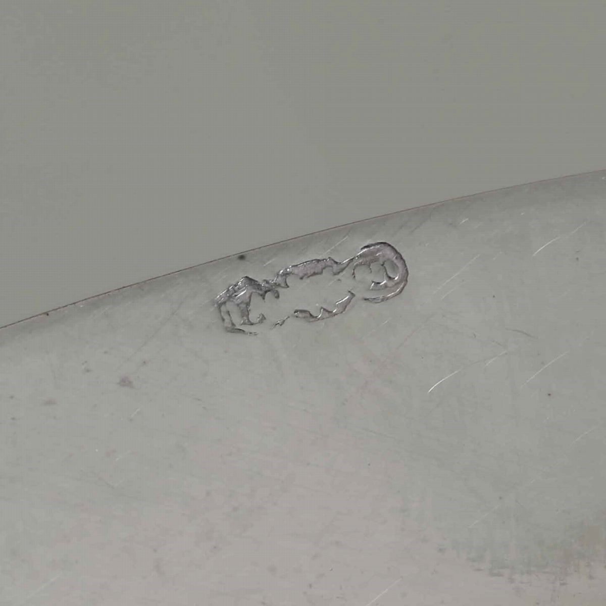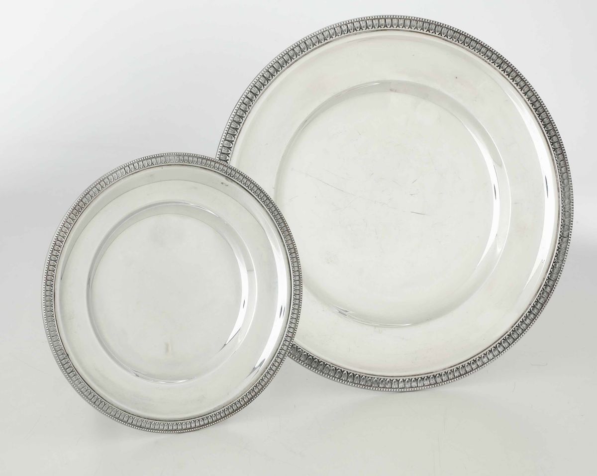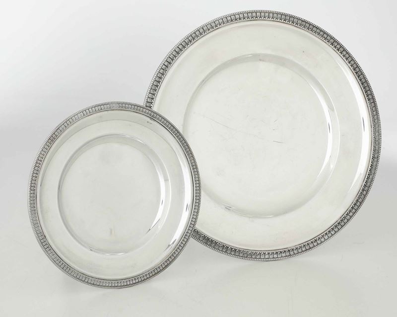 Coppia di piatti diversi in argento fuso e cesellato. Diverse manifatture italiane del XX secolo