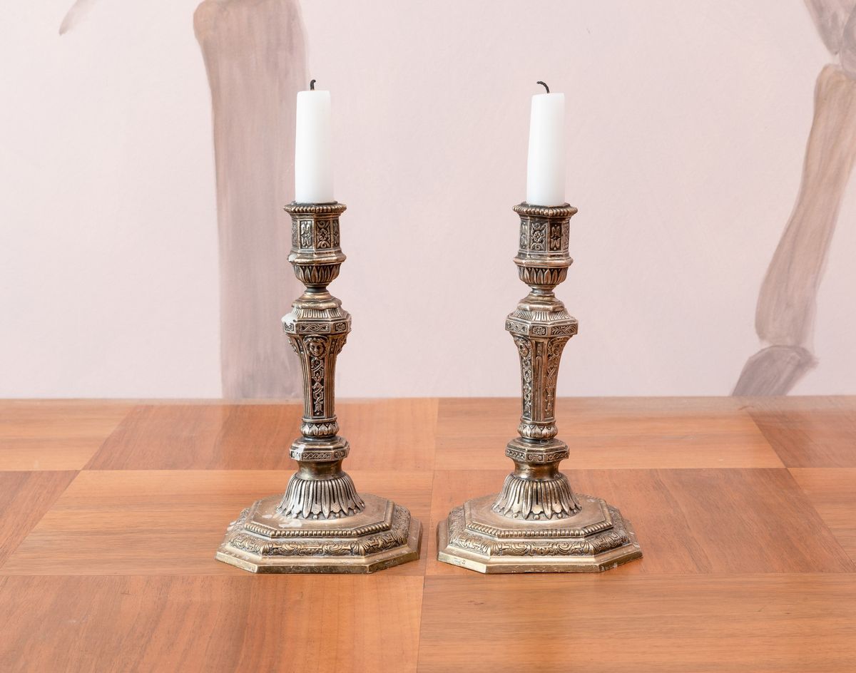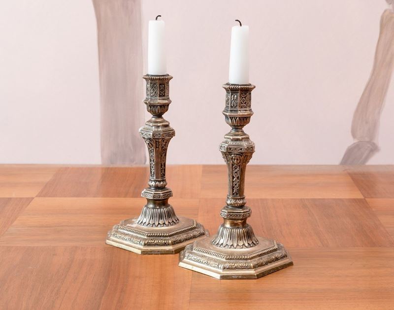 Coppia di candelieri in metallo argentato. Francia, prod. Christofle, XX secolo
