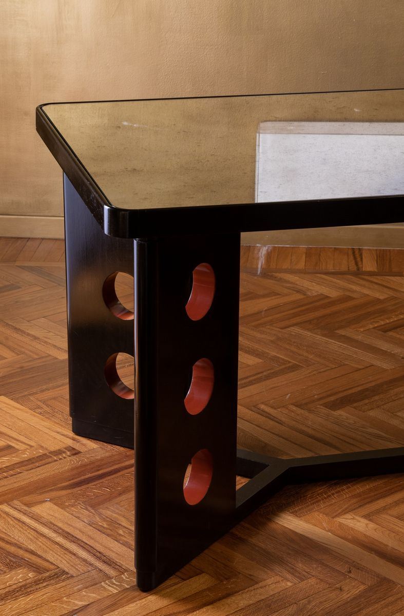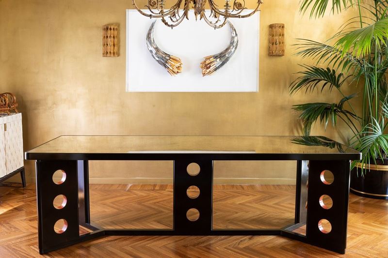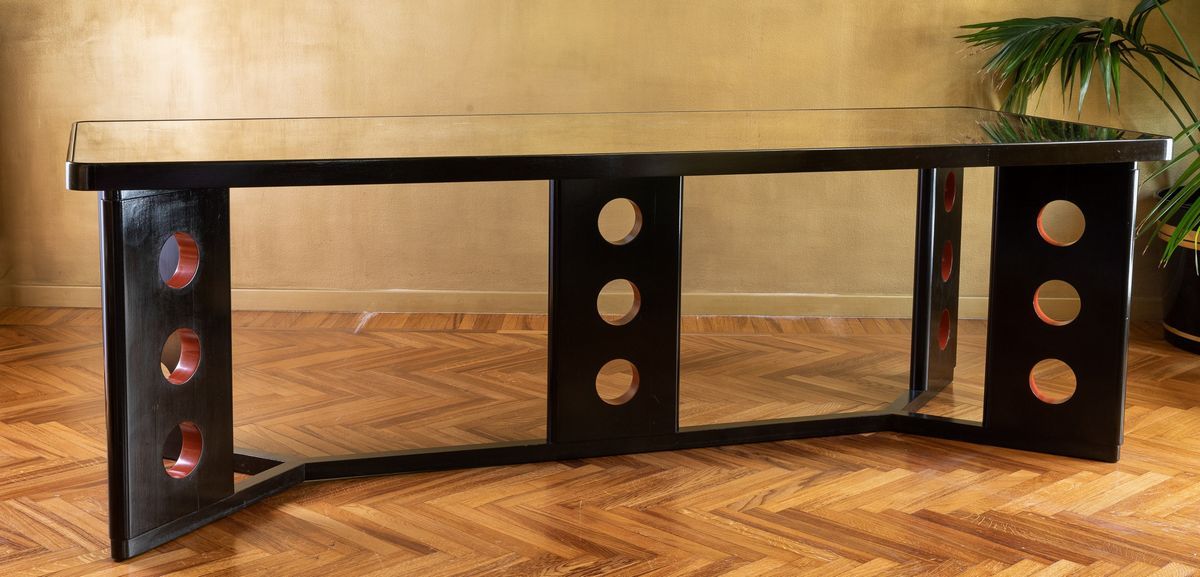 Struttura in frassino e ciliegio. Piano in vetro specchiato.