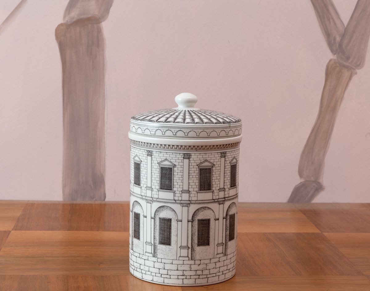 Vaso con coperchio in ceramica smaltata decorato con motivo Architettura.