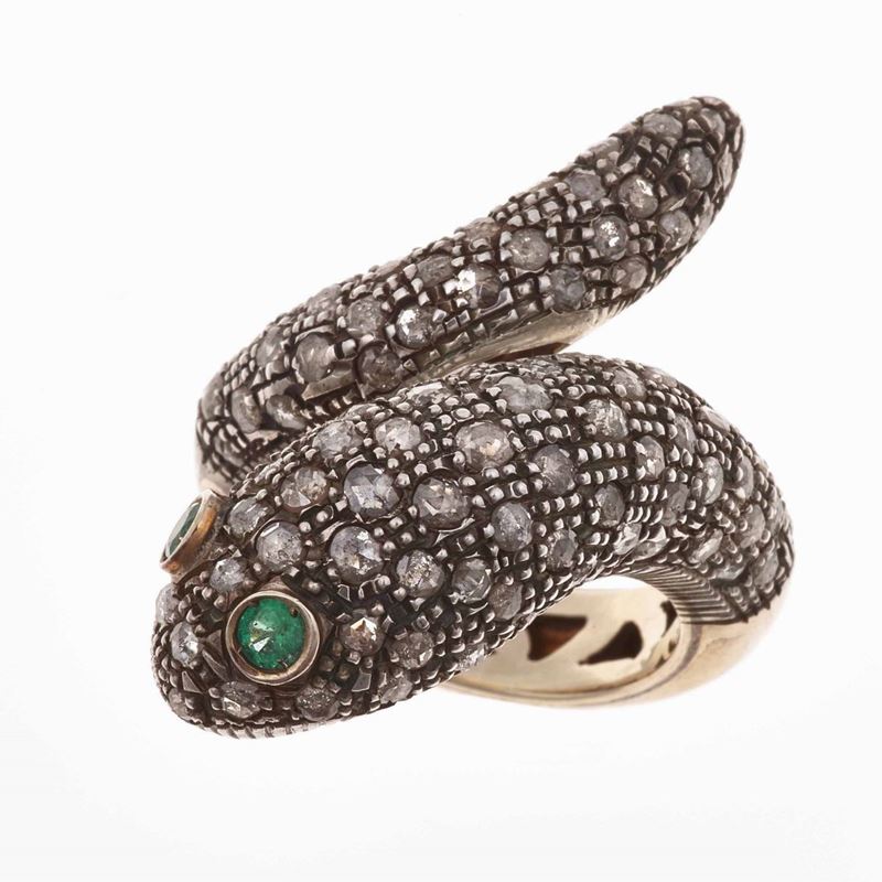 Rose-cut diamond, emerald, gold and silver ring