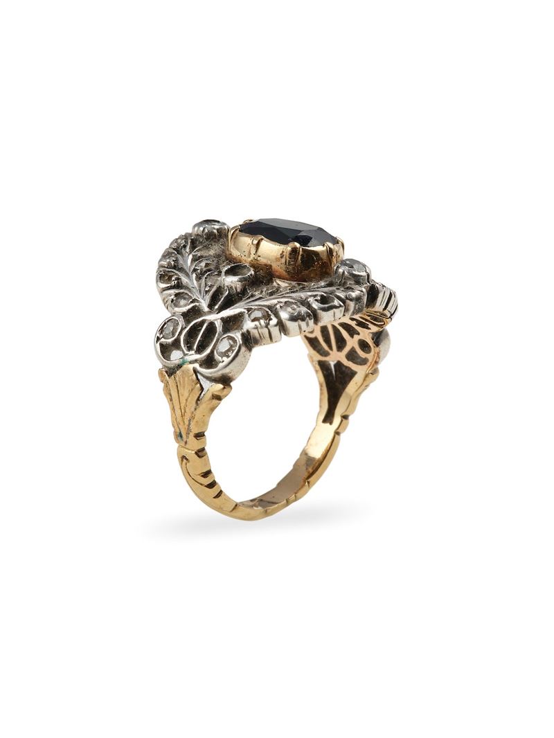 Sapphire, old-cut diamond, silver and gold brooch and ring