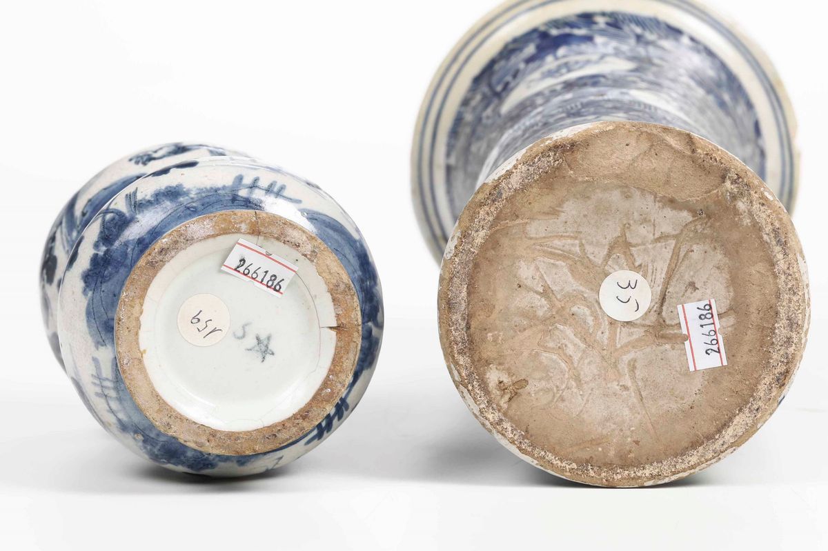 Al lotto si aggiunge un vaso a tromba di Delft, XVIII secolo (altezza cm 28,5; conservazione: felature e restauro al bordo superiore)
