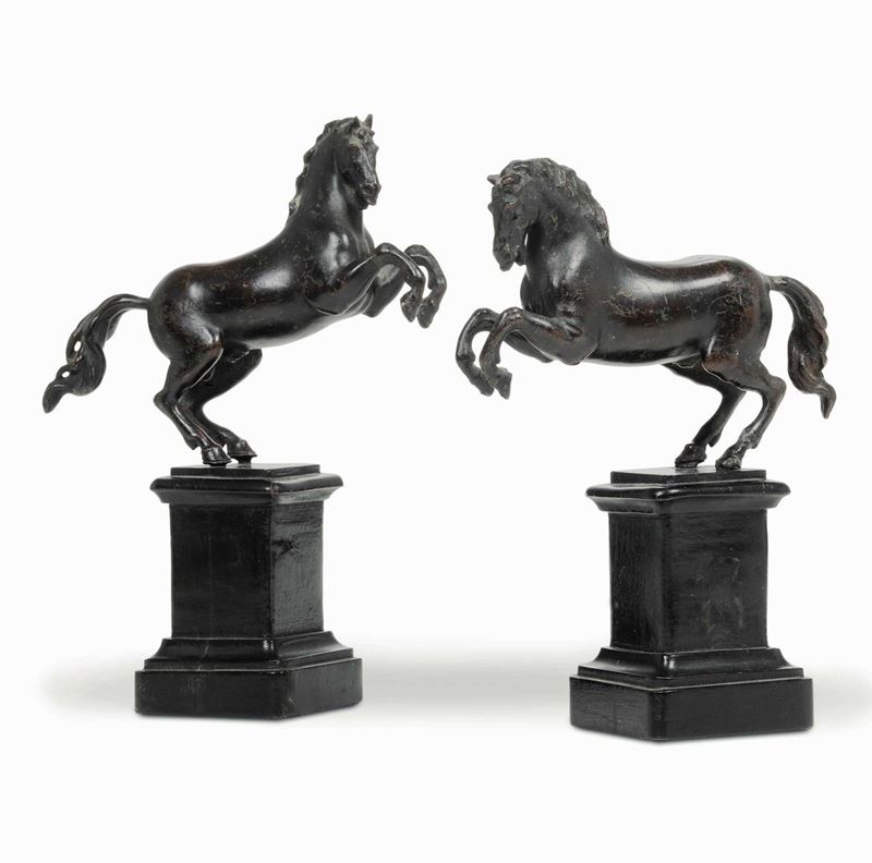 Coppia di cavalli rampanti in bronzo fuso e cesellato. Fonditore italiano del XVII-XVIII secolo