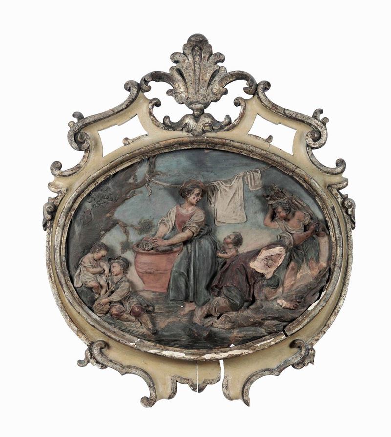 Serie di quattro placche ovali in terracotta a rilievo dipinta con scene bucoliche. Bologna XVIII secolo