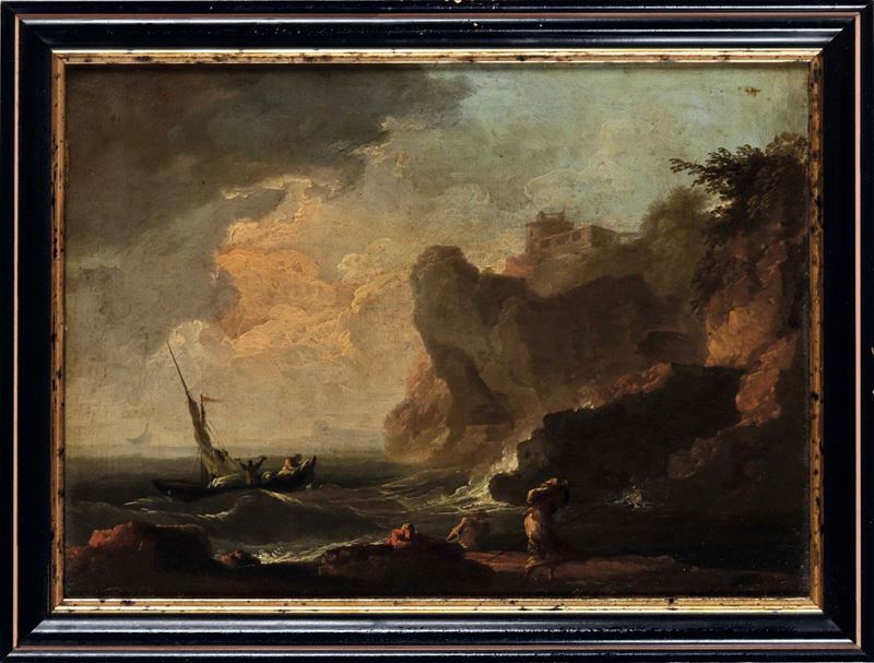 Scuola del XVIII secolo Vedute costiere con figure e velieri
