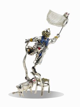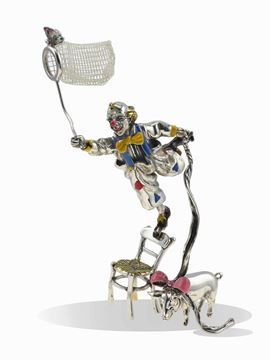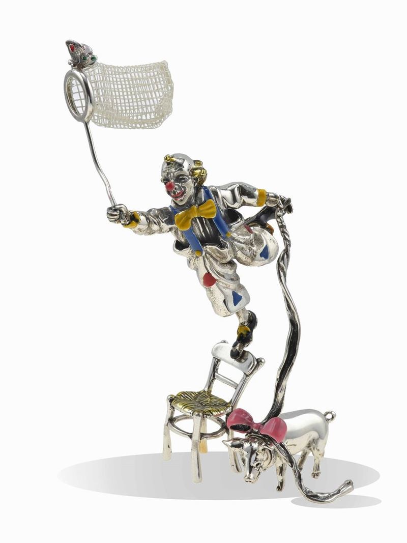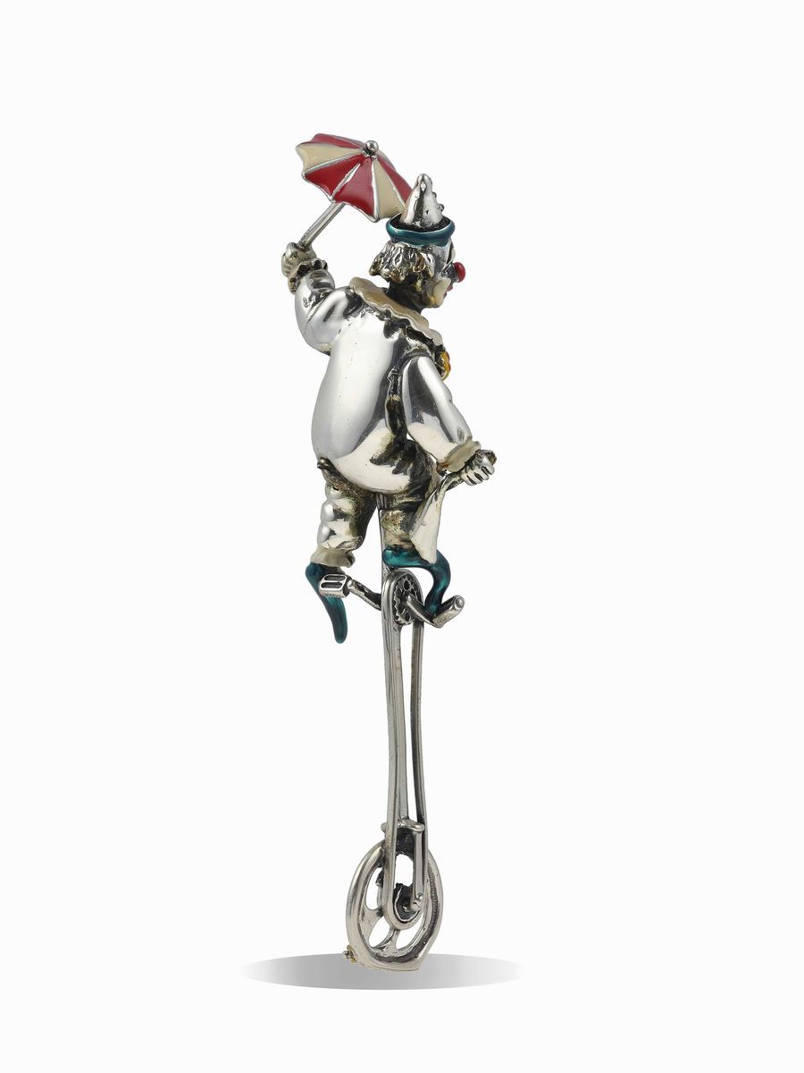 Two silver and enamel clowns, designed by Gene Moore for Tiffany & Co.