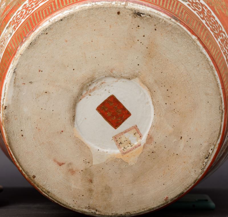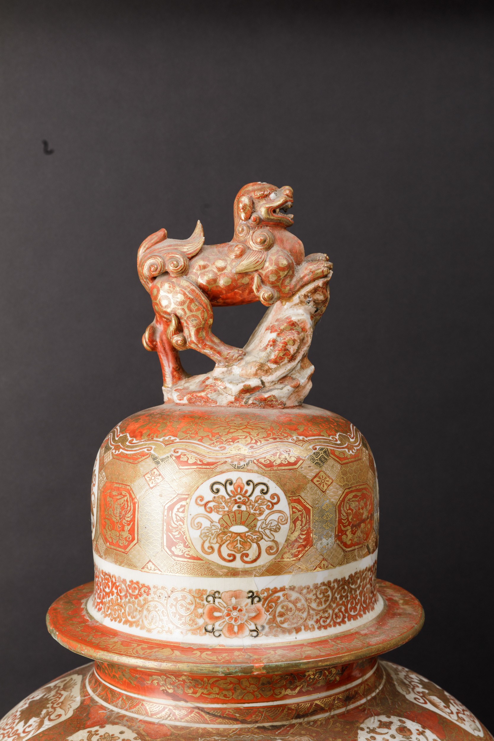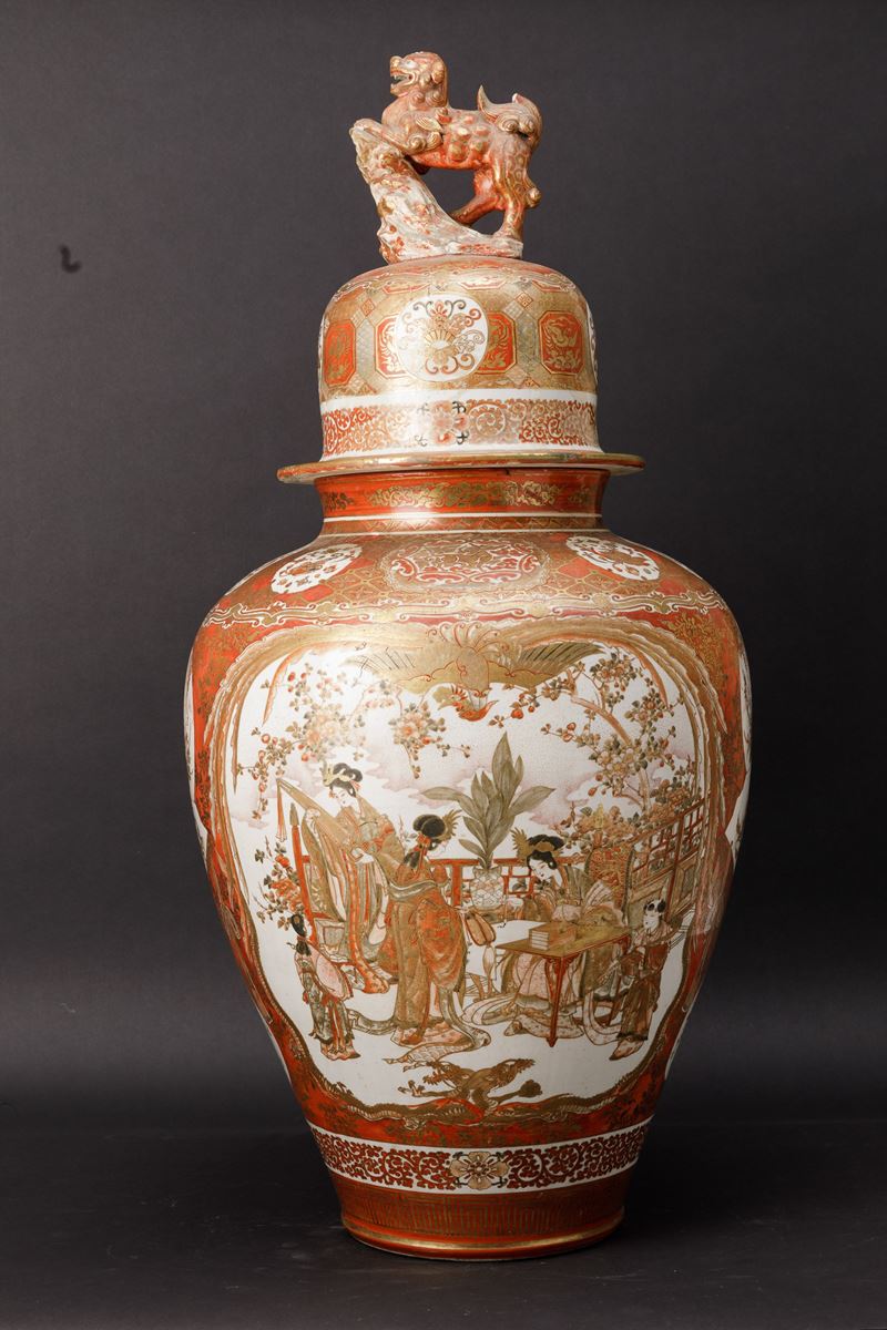 (1868-1912). Kutani porcelain with naturalistic scenes, floral decors and a lion-shaped handle on the lid.