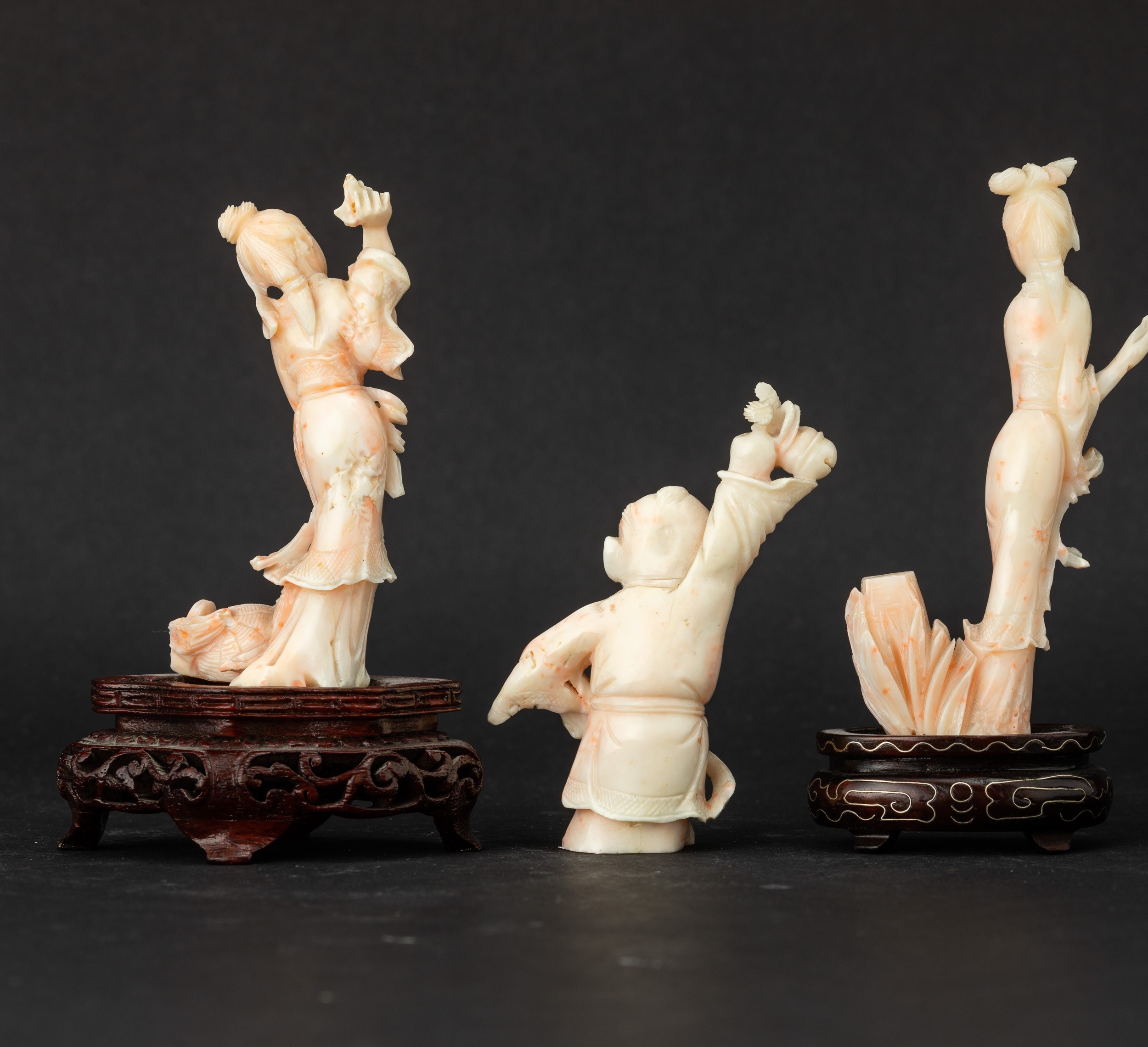 Three pink coral figures, China, early 1900s
