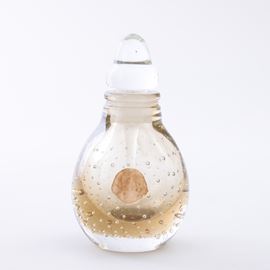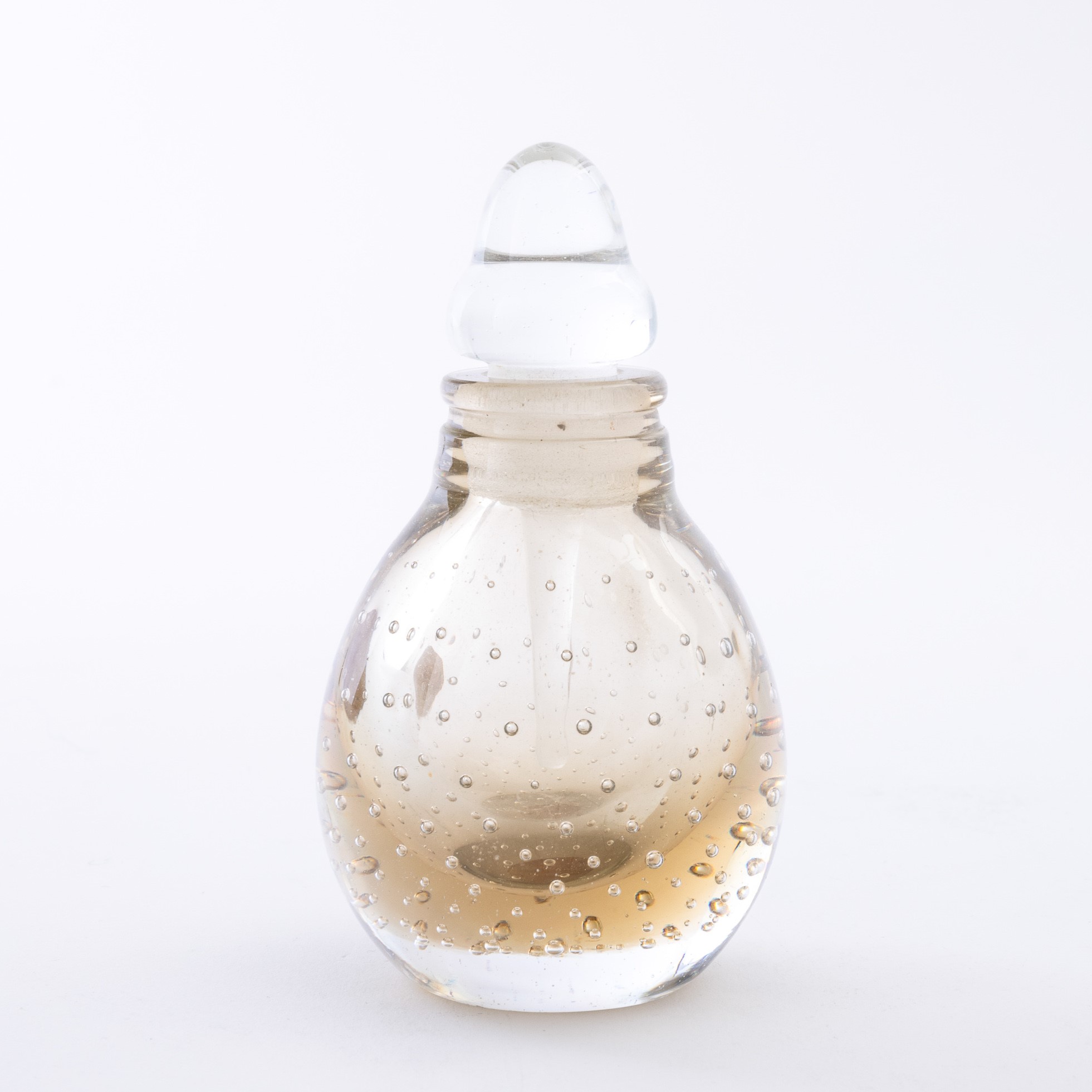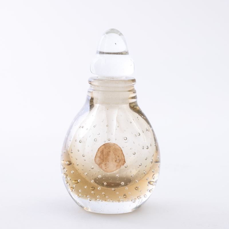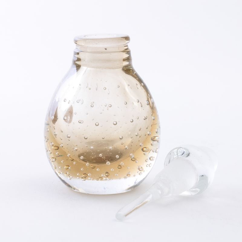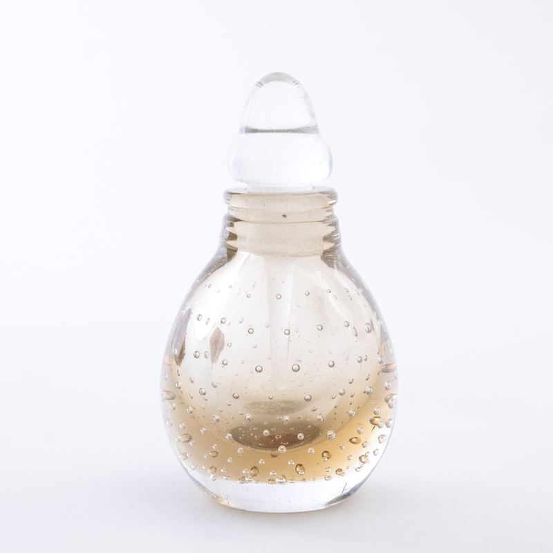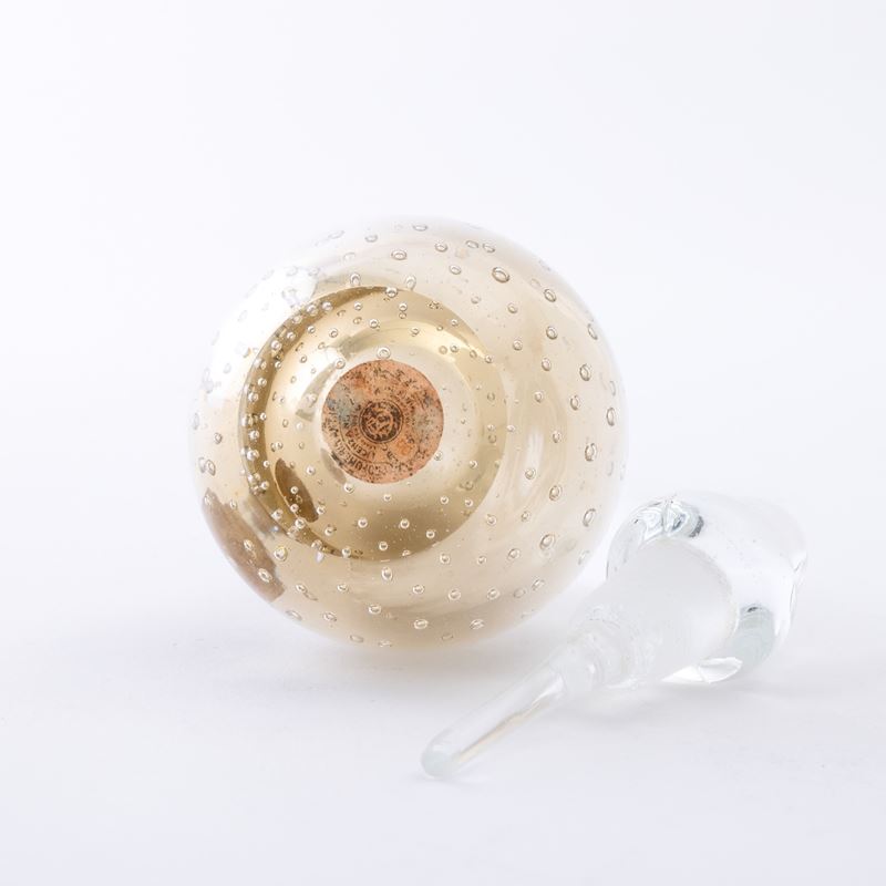 A heavy Sommerso glass perfume bottle with a bubble decor. Old paper label and acid-etched signature Venini Murano