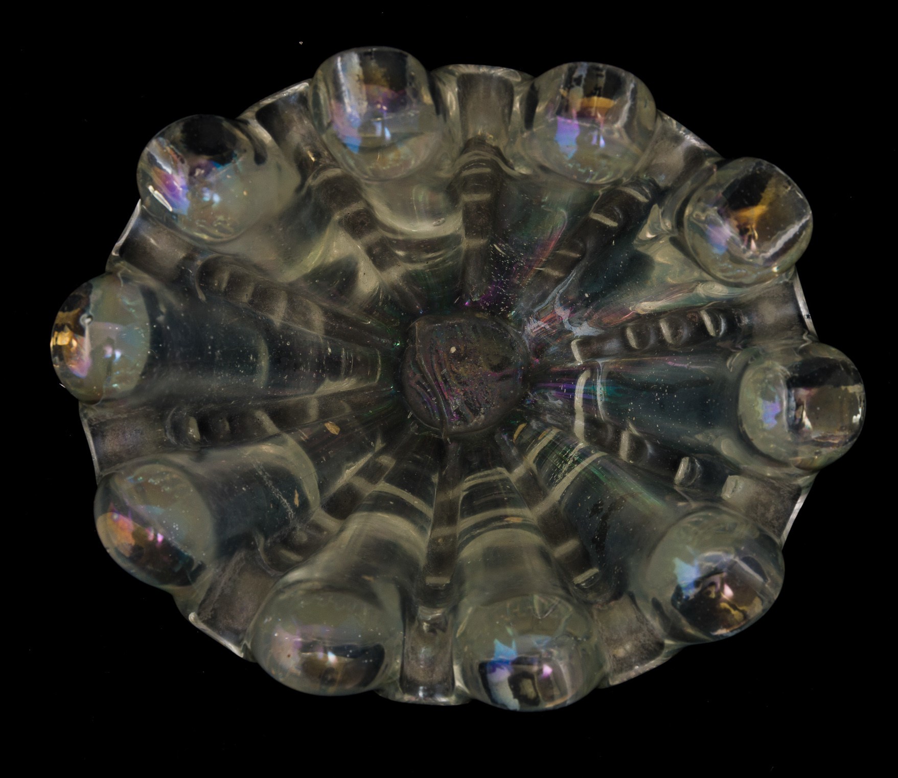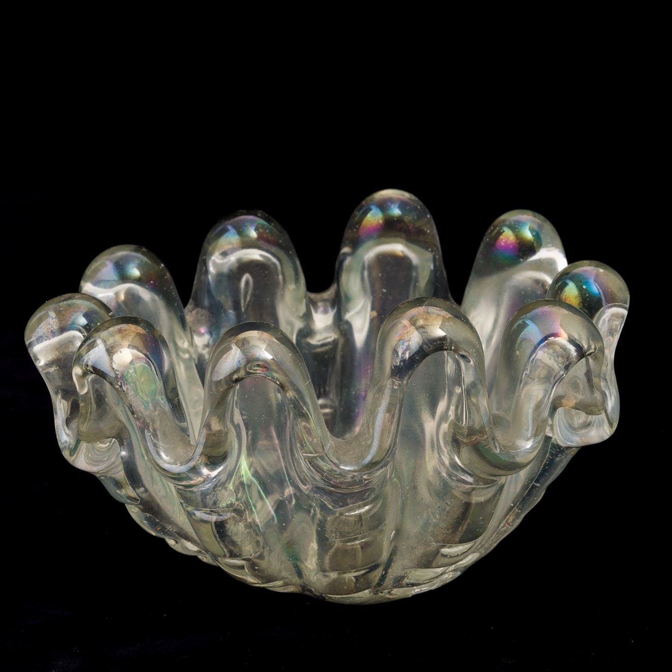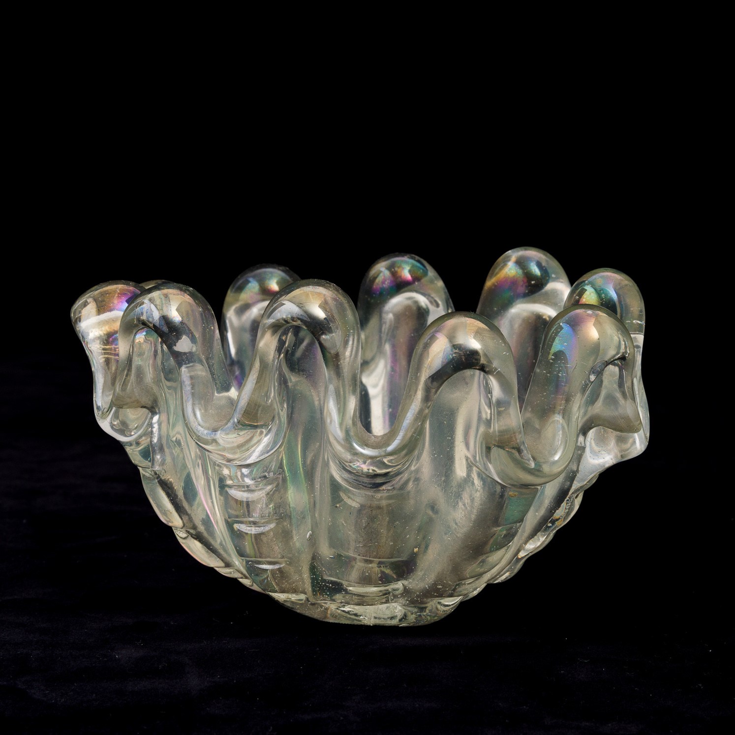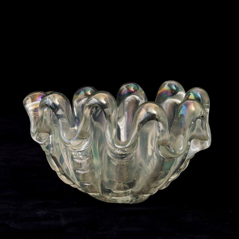 A heavy iridised oval glass bowl from the A Grosse Costolature series