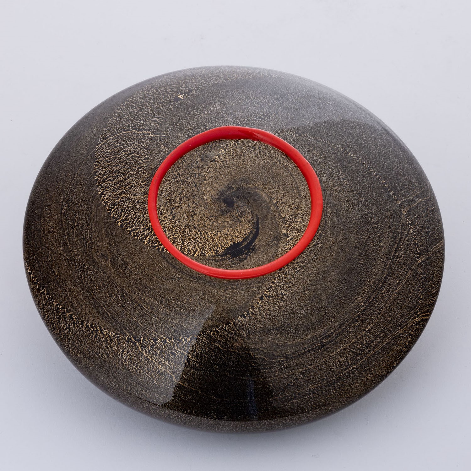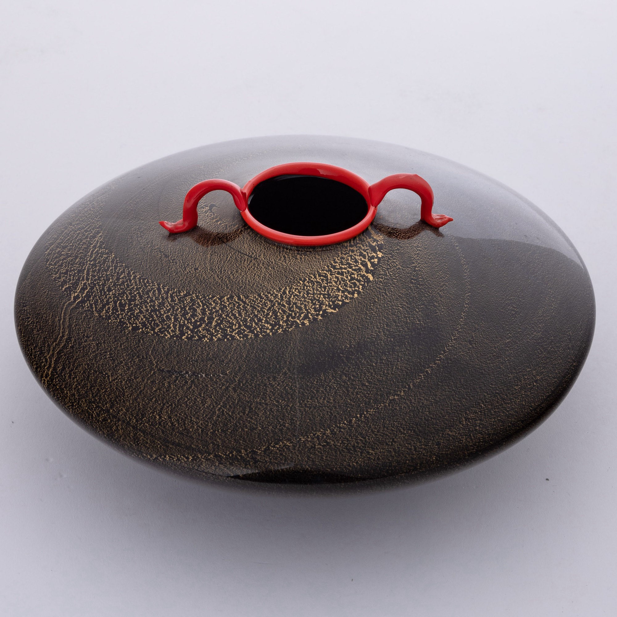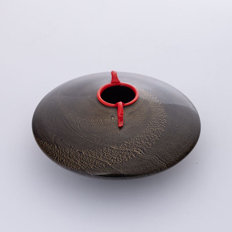 A spherical blown glass vase with a gold leaf decor