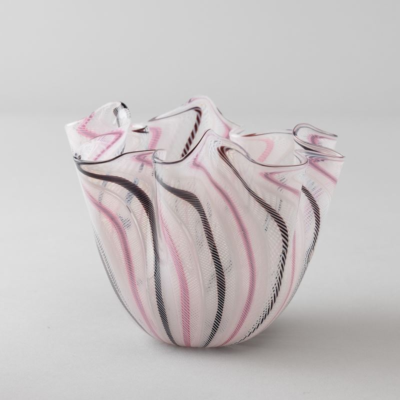 A small Fazzoletto vase with a polychrome decor. Acid-etched signature Venini Murano Made in Italy