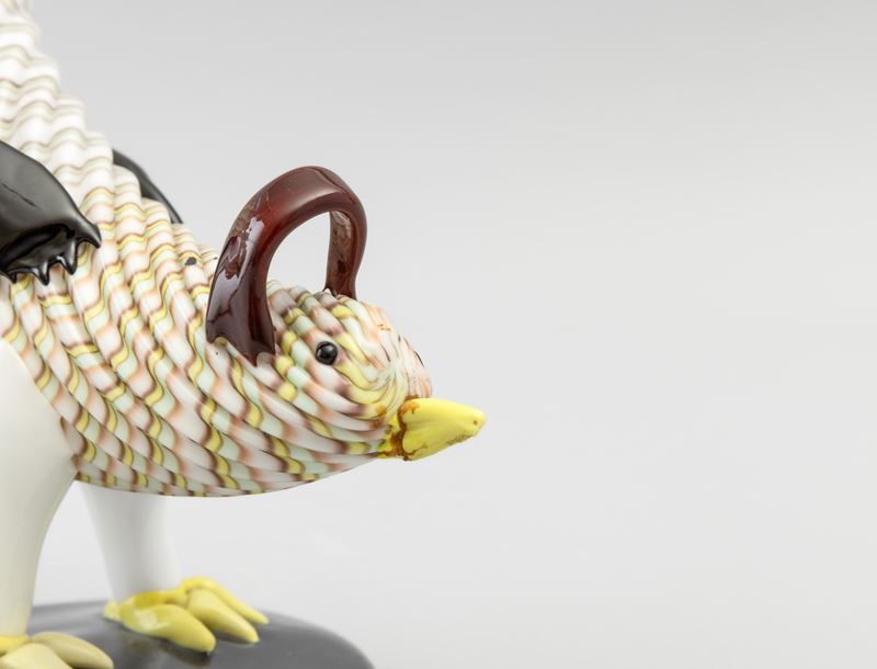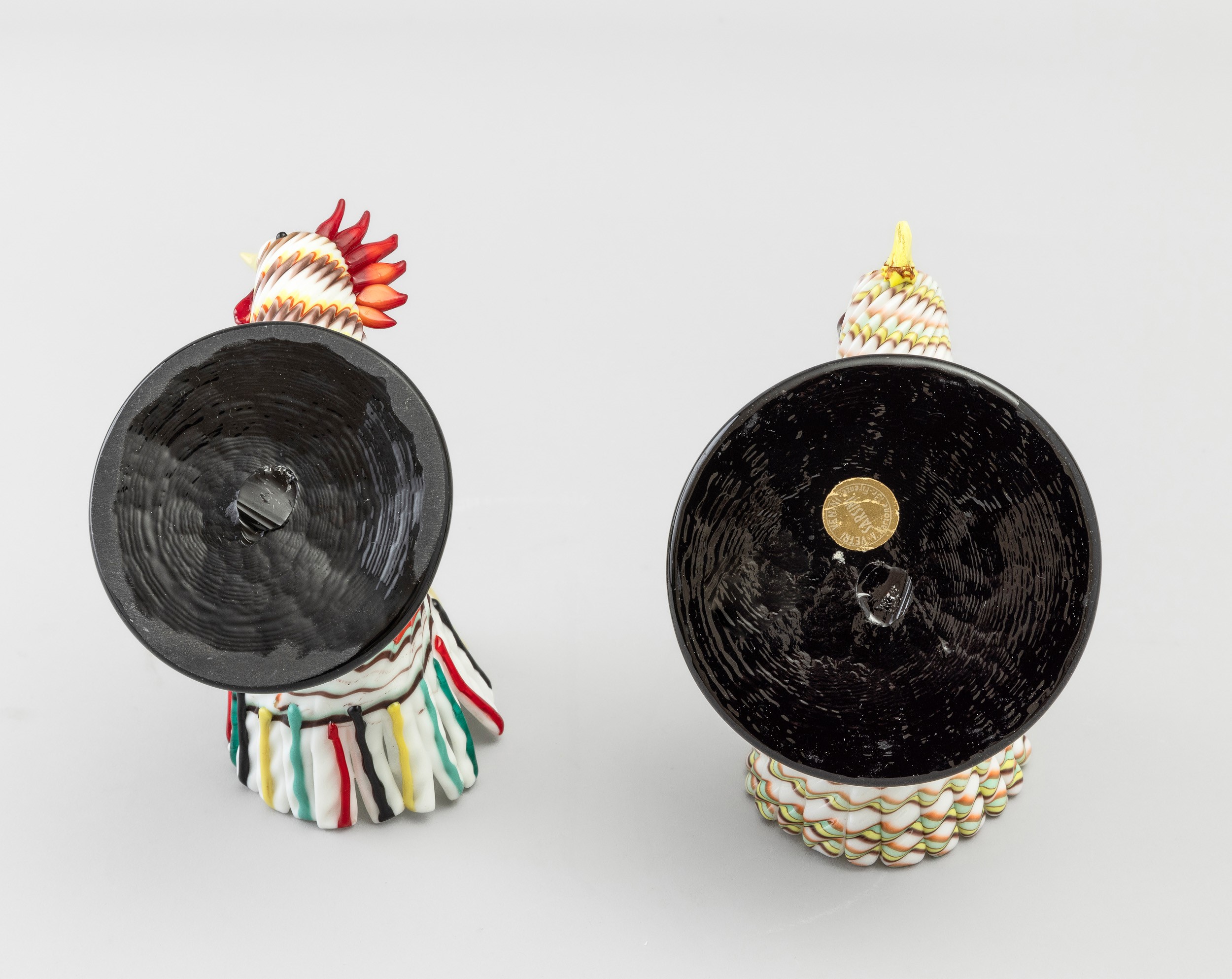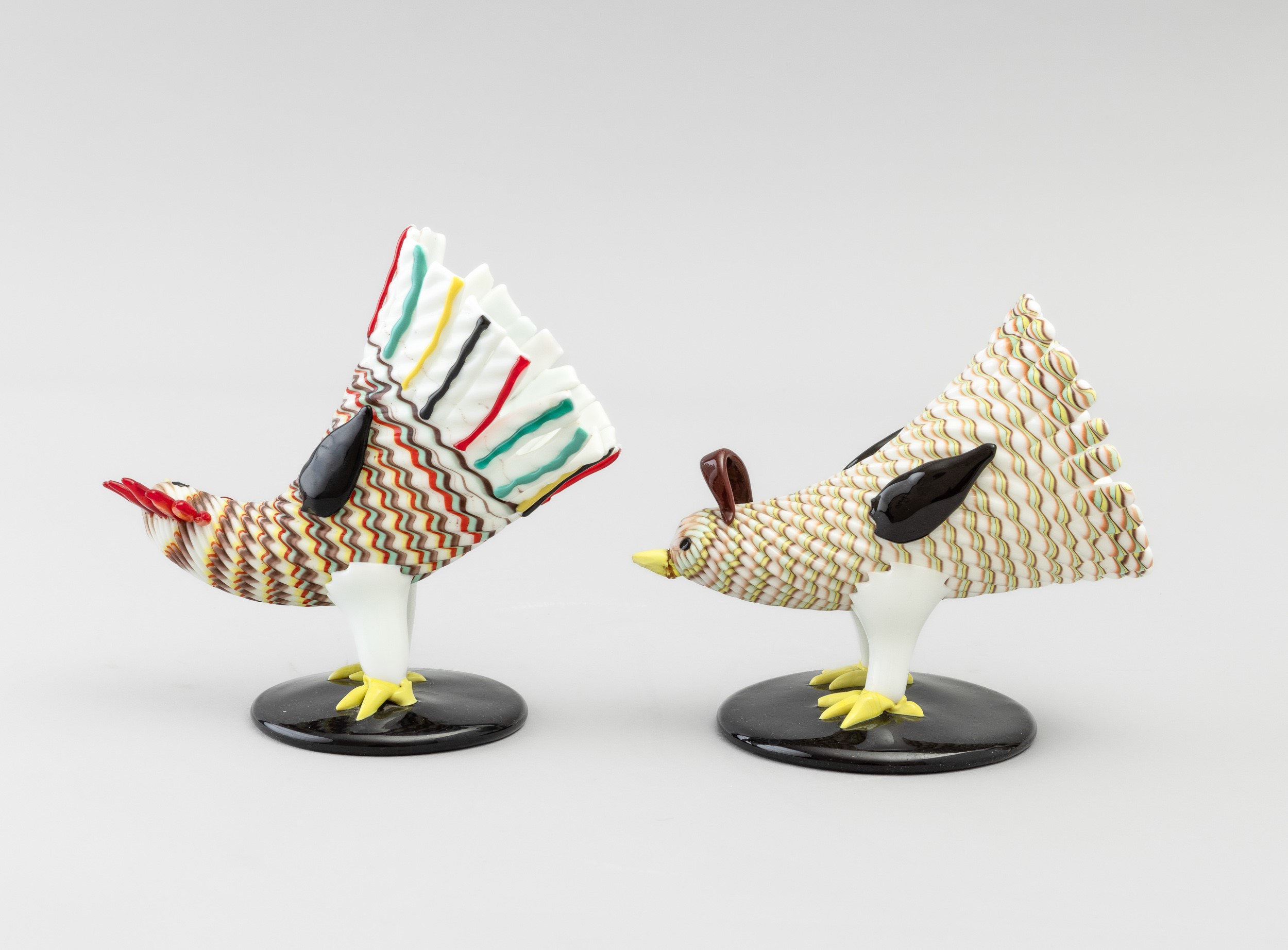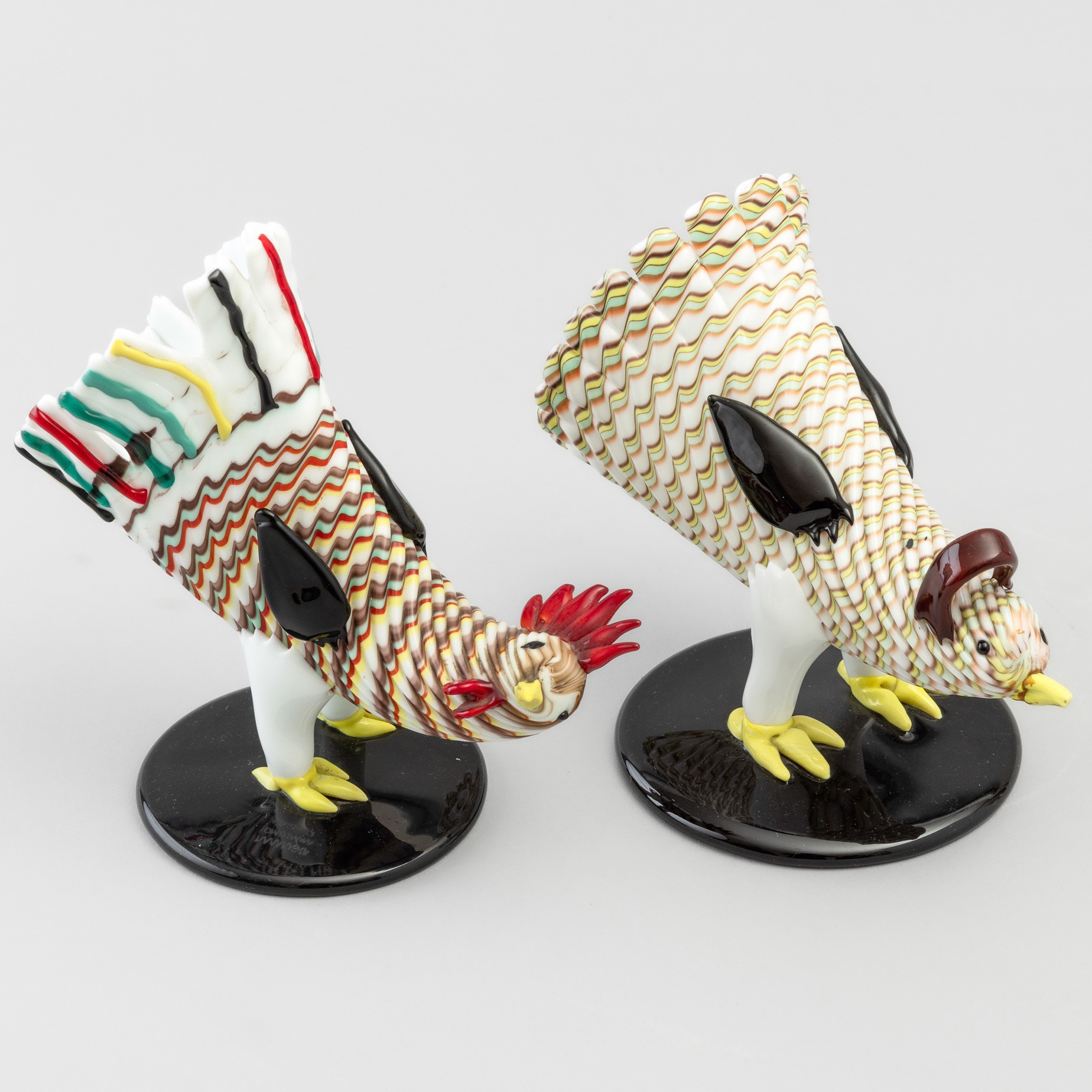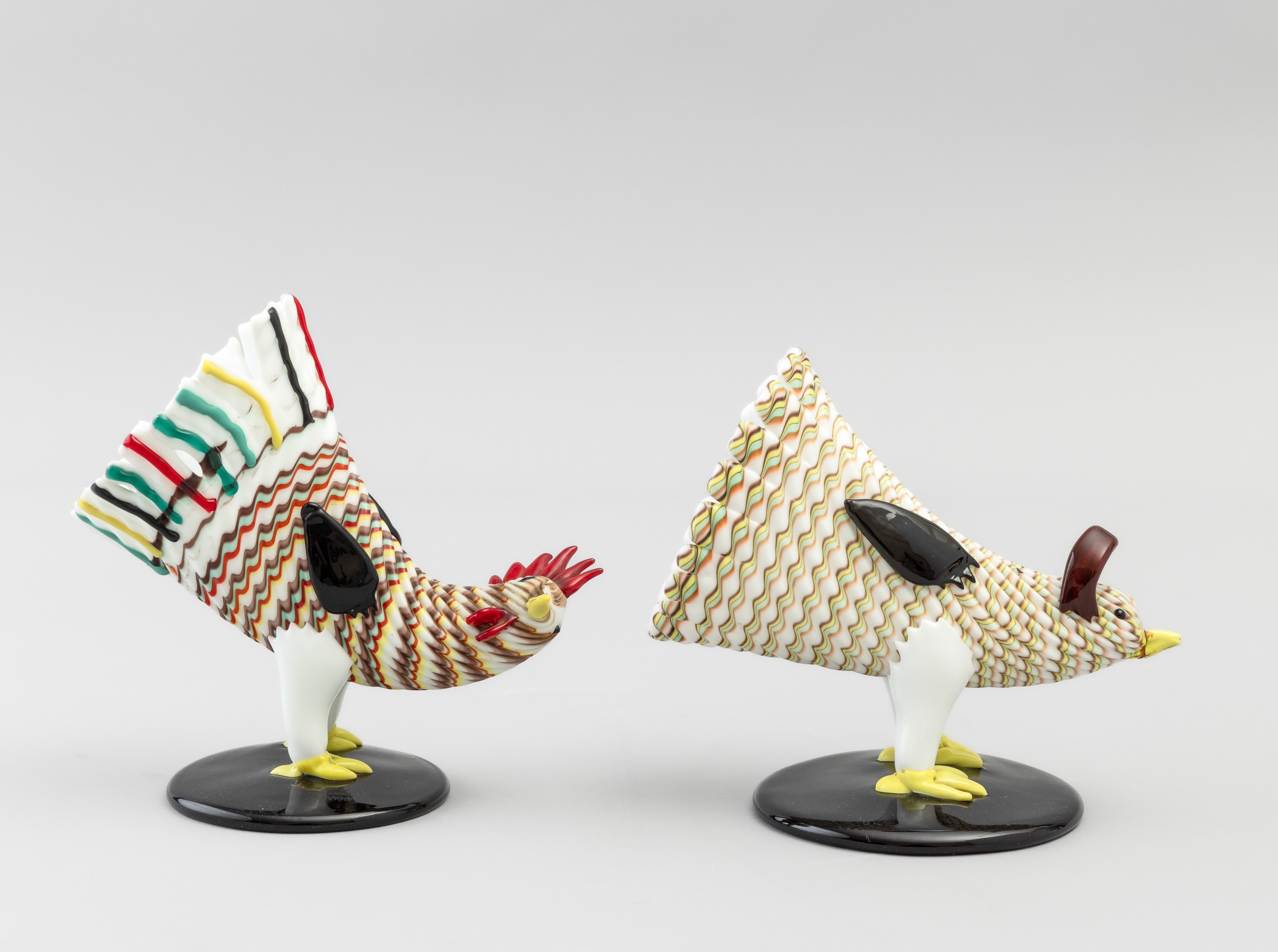 Two sculptures in the shape of a rooster and hen in Lattimo glass on a black base. Etched signature Murano Made in Italy. Restoration on one beak