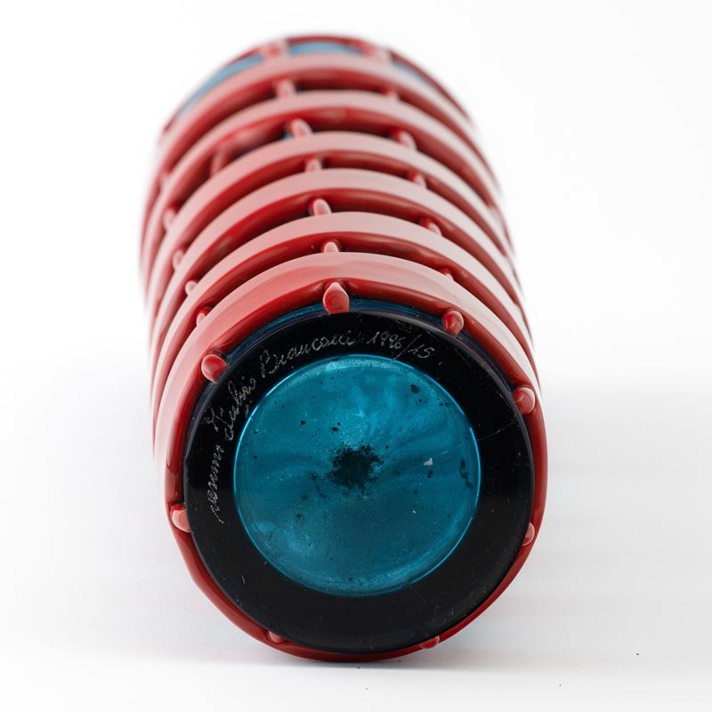 A clear aquamarine glass vase with a red decor. Old label and signature Venini Fulvio Bianconi 1996/15