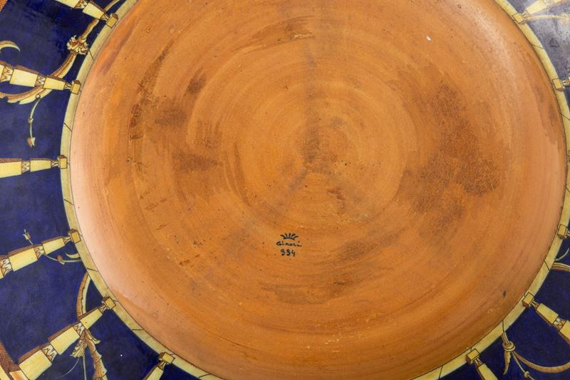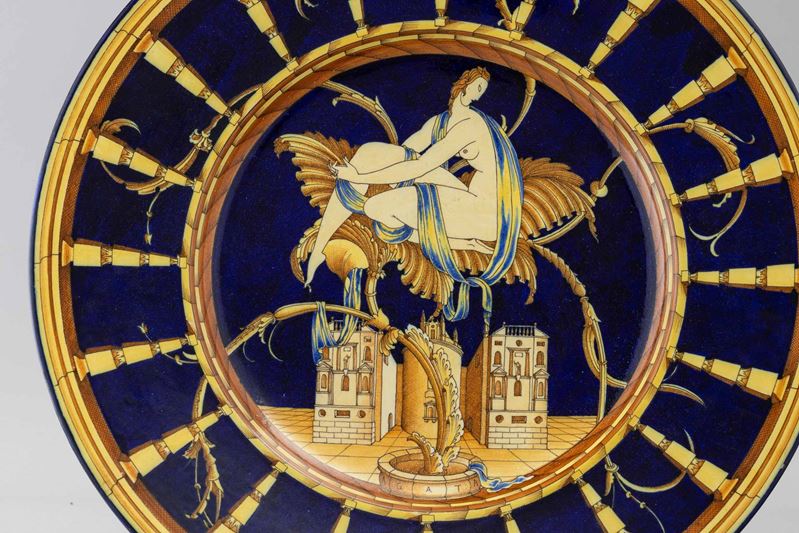 A large majolica terracotta plate from the Le Mie Donne series with a decor depicting a nude woman on a classical architectural backdrop. Maker's mark
