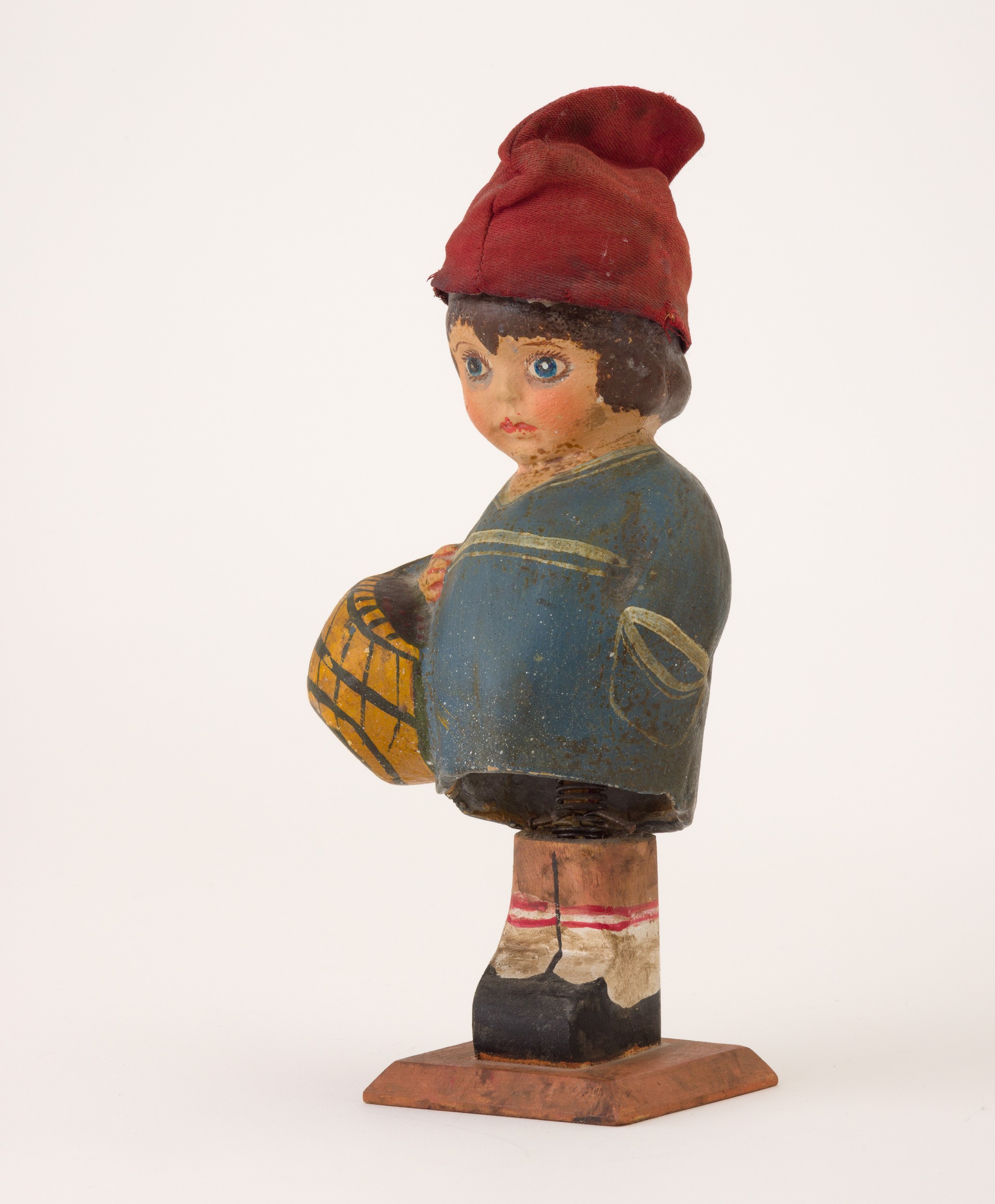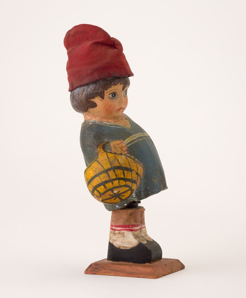 A spring-operated carved wood toy of a little boy, partially moving