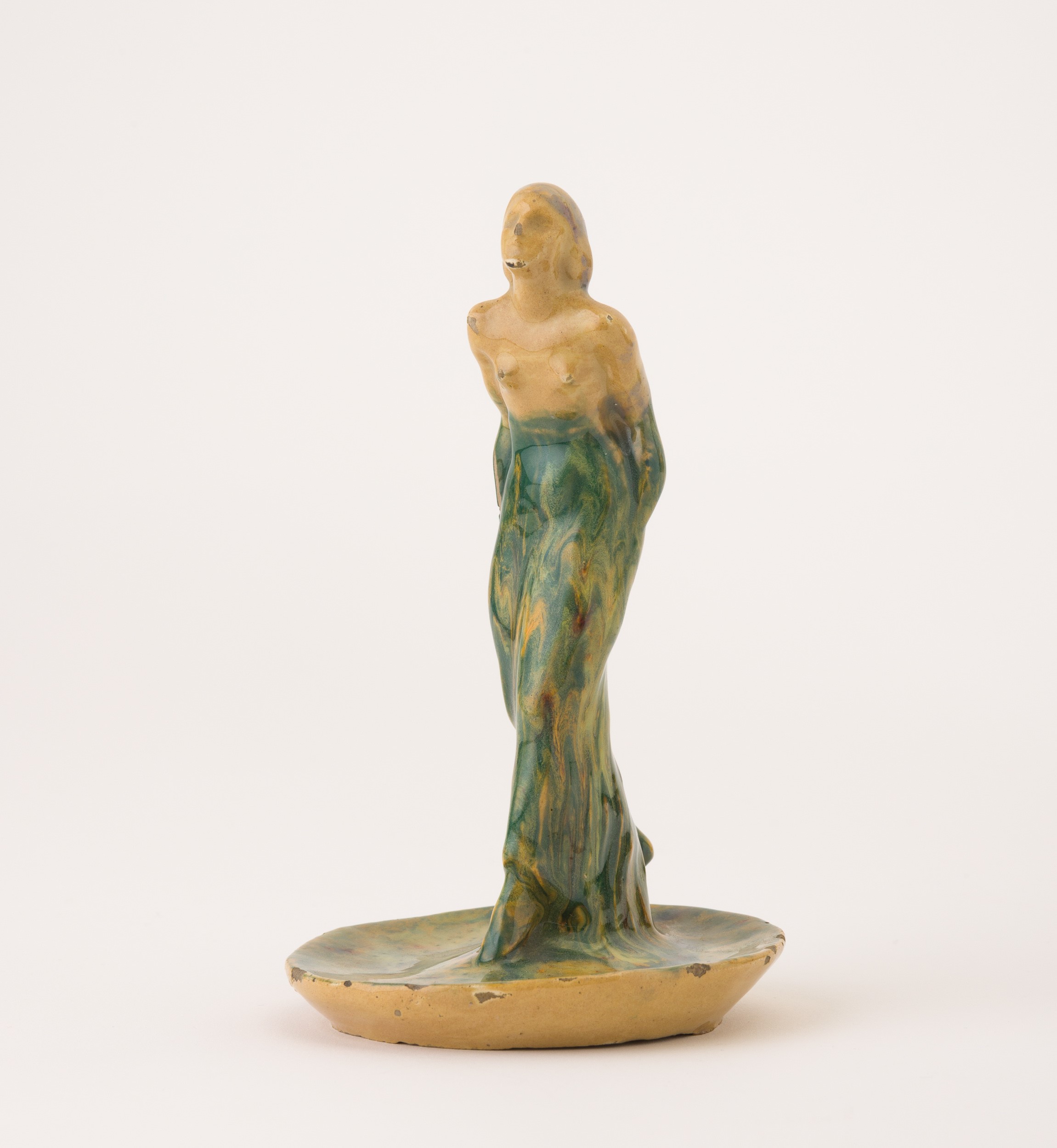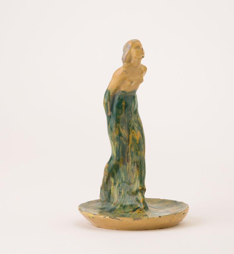 A small ceramic sculpture of a woman with a polychrome enamel decor