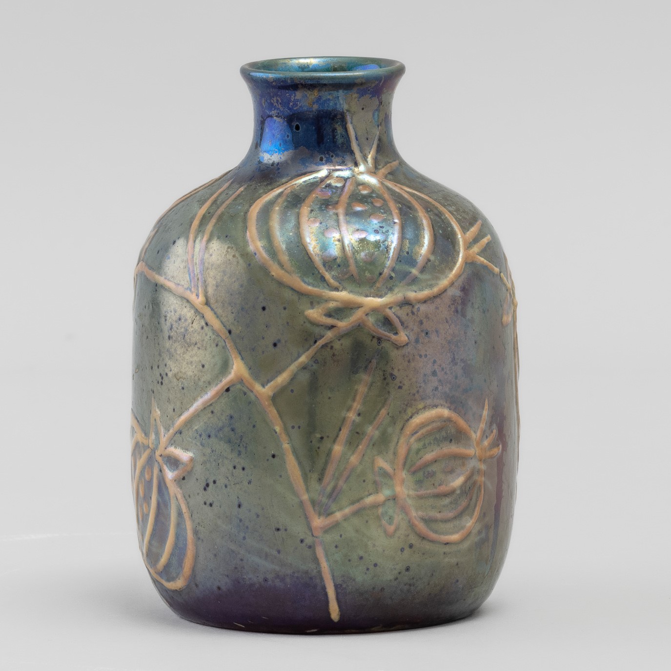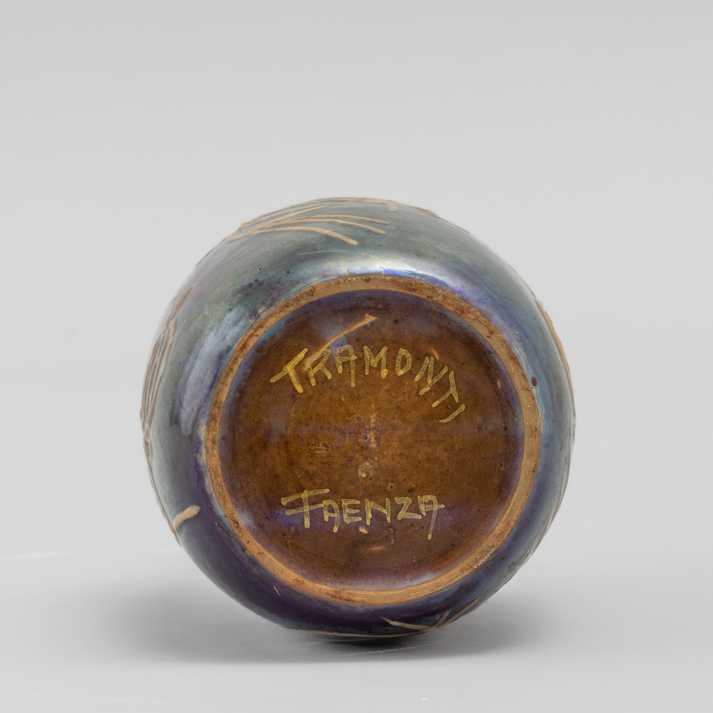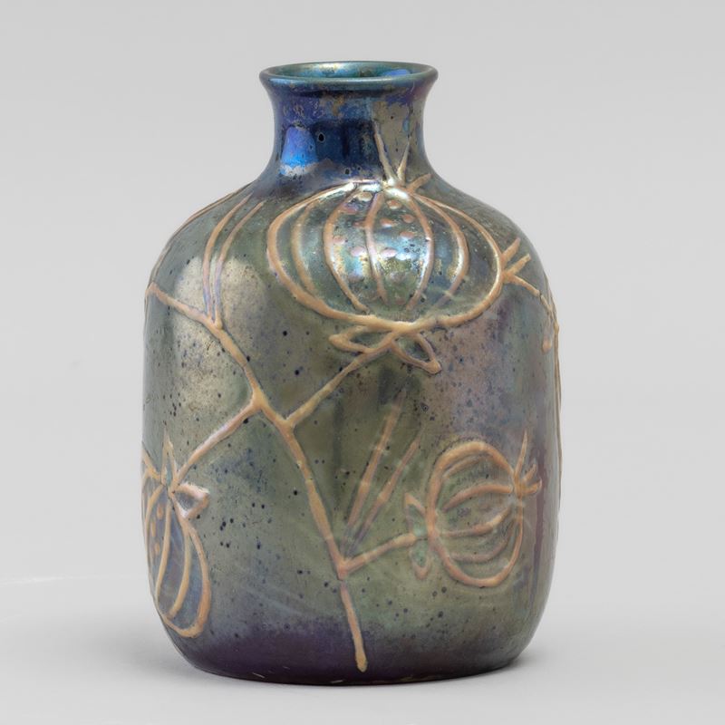 A majolica terracotta vase with an embossed decor. Signed by the author on the base