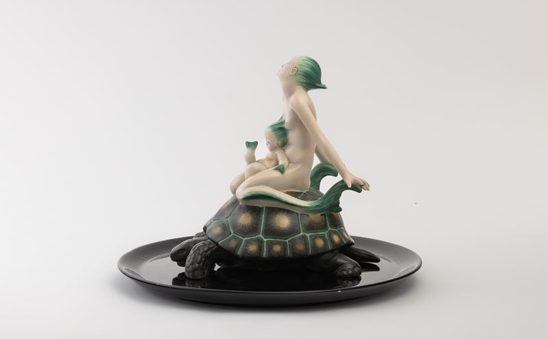 An earthenware ceramic figure of a mermaid with a polychrome decor on a black enamelled plate. Maker's mark. Minor broken parts