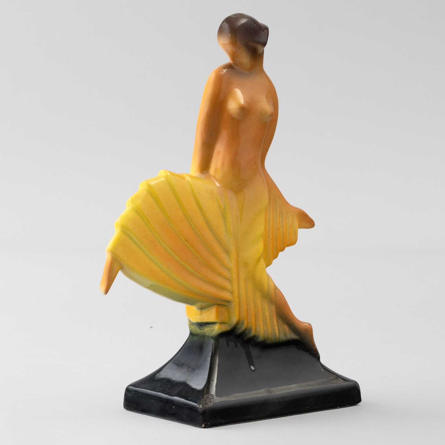 A ceramic figure of a dancer with a polychrome enamel decor. Maker's mark