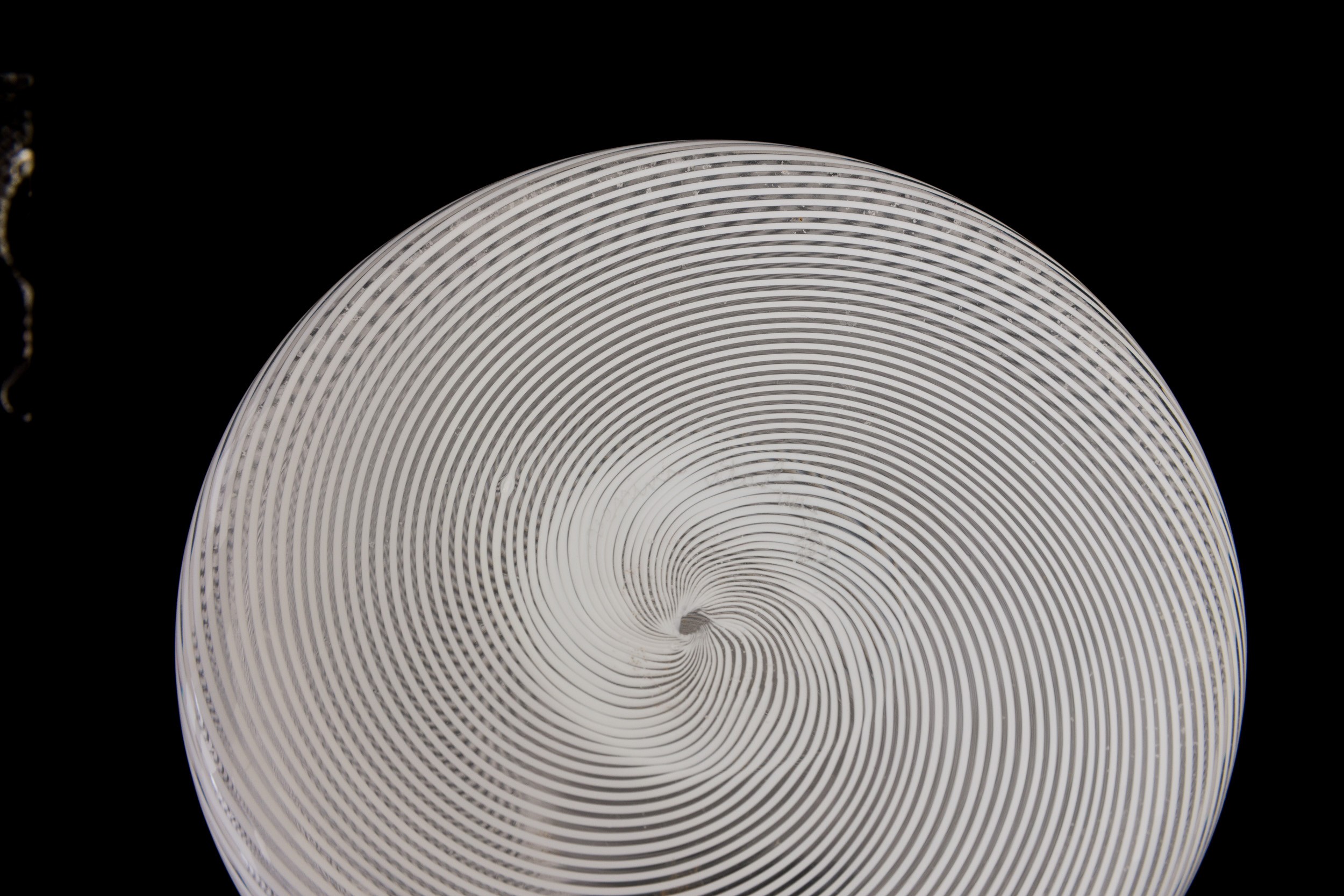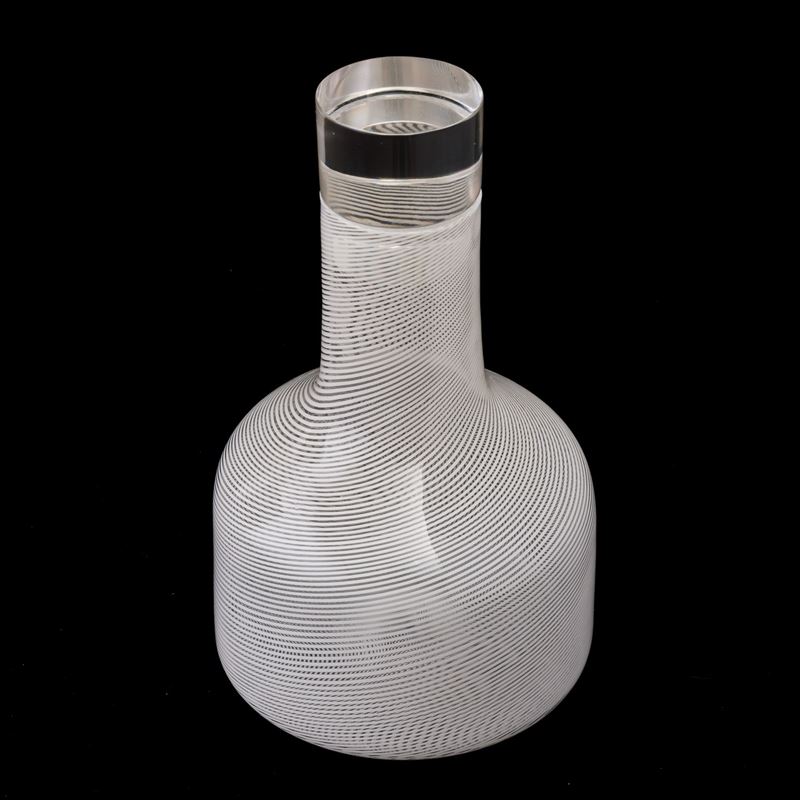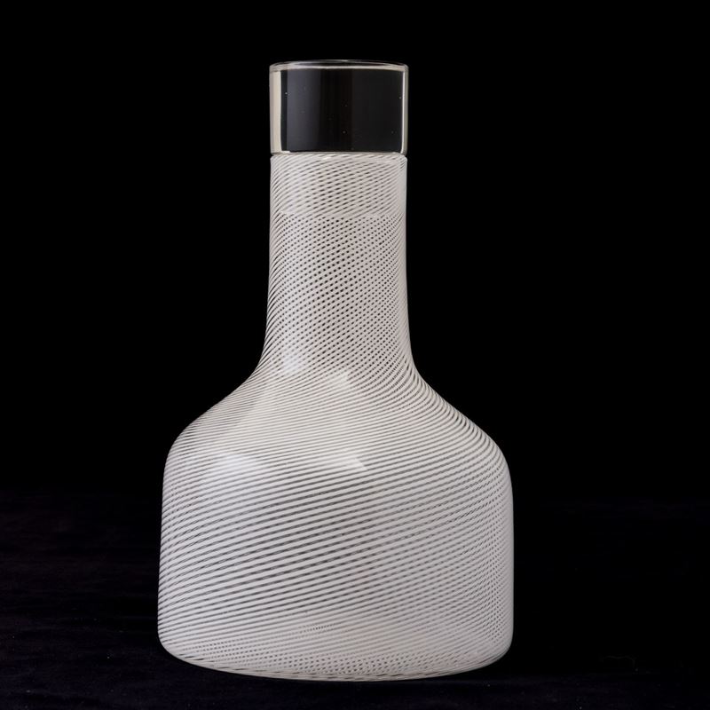 A blown glass bottle from the Rovaniemi series with a Lattimo filigree decor. Etched signature Venini Italia TW
