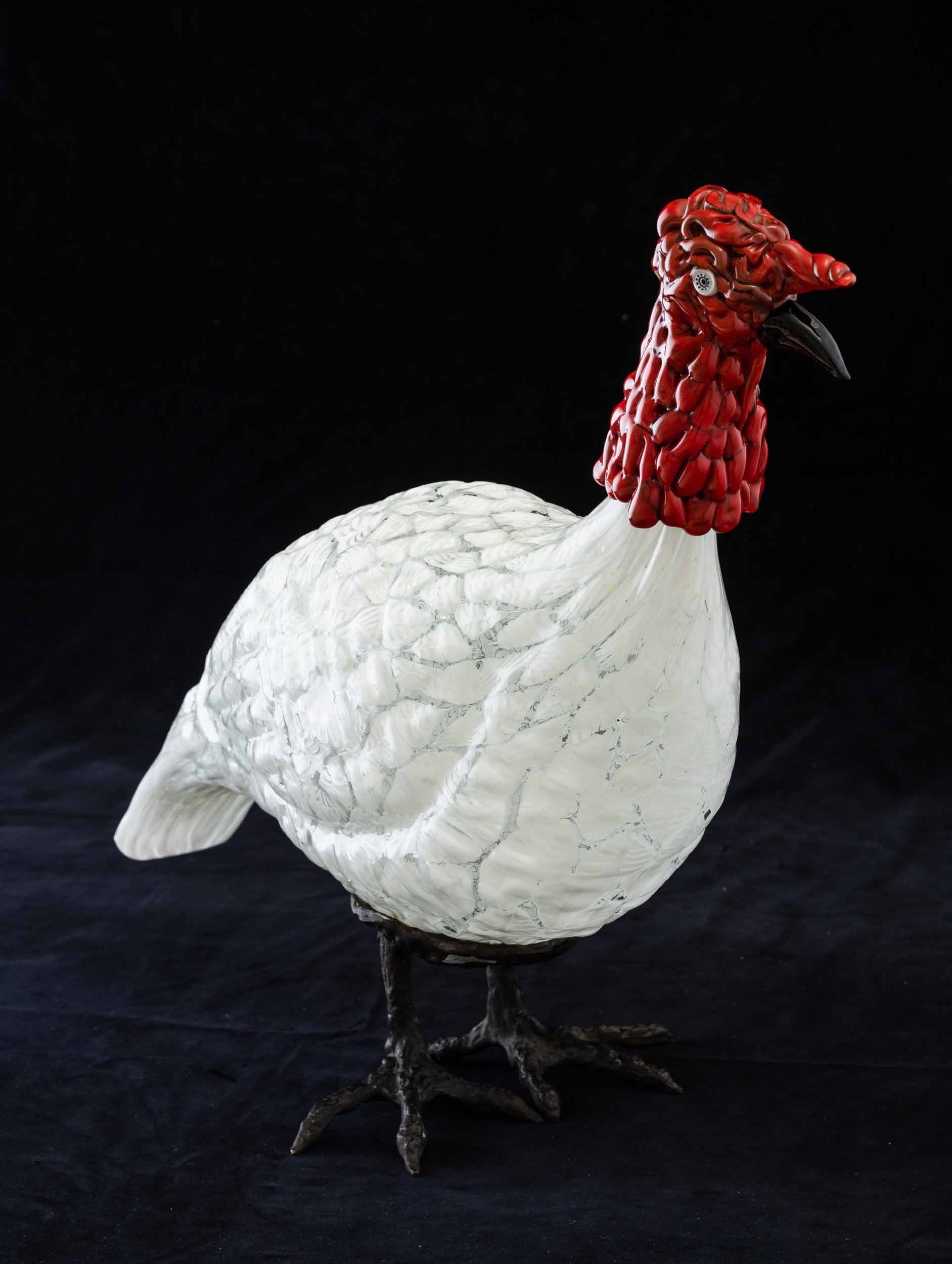 A sculpture of a turkey with cire-perdue bronze legs, blown glass body with a decor of murrine, and a coral coloured glass head. Signed.