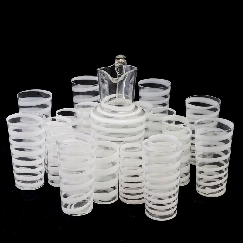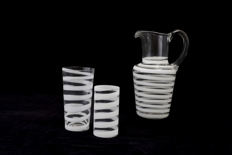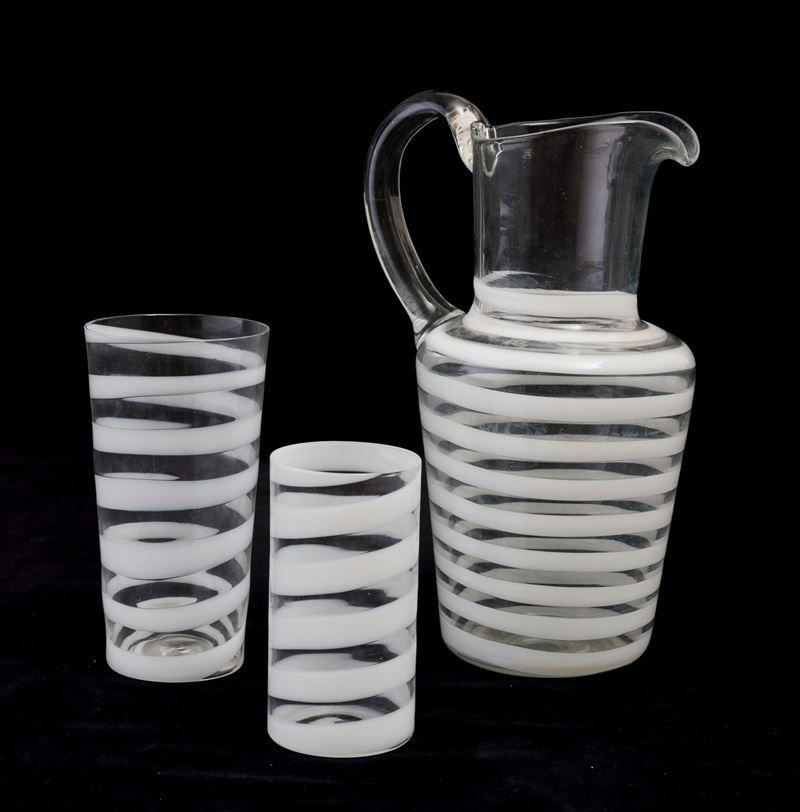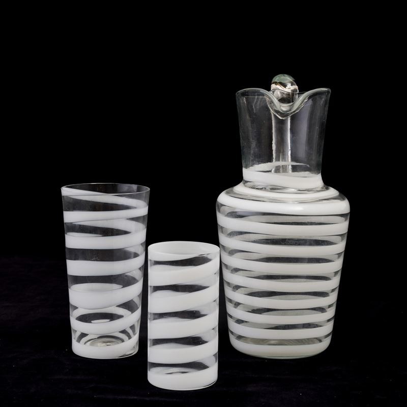 A set of glasses and a pitcher in blown glass with a Lattimo decor