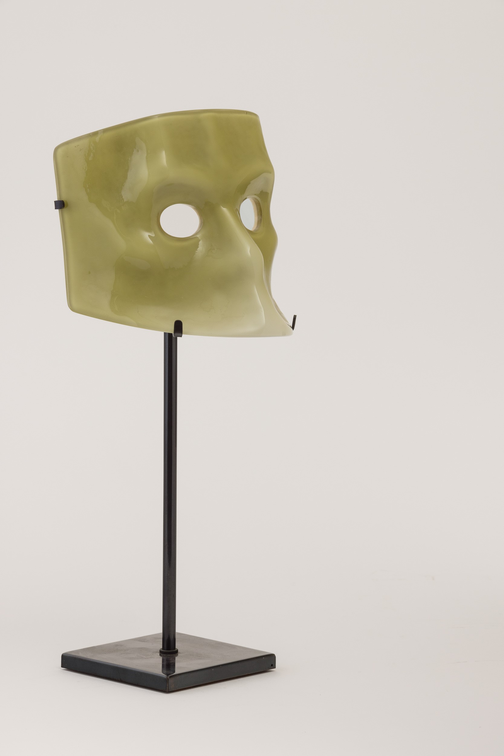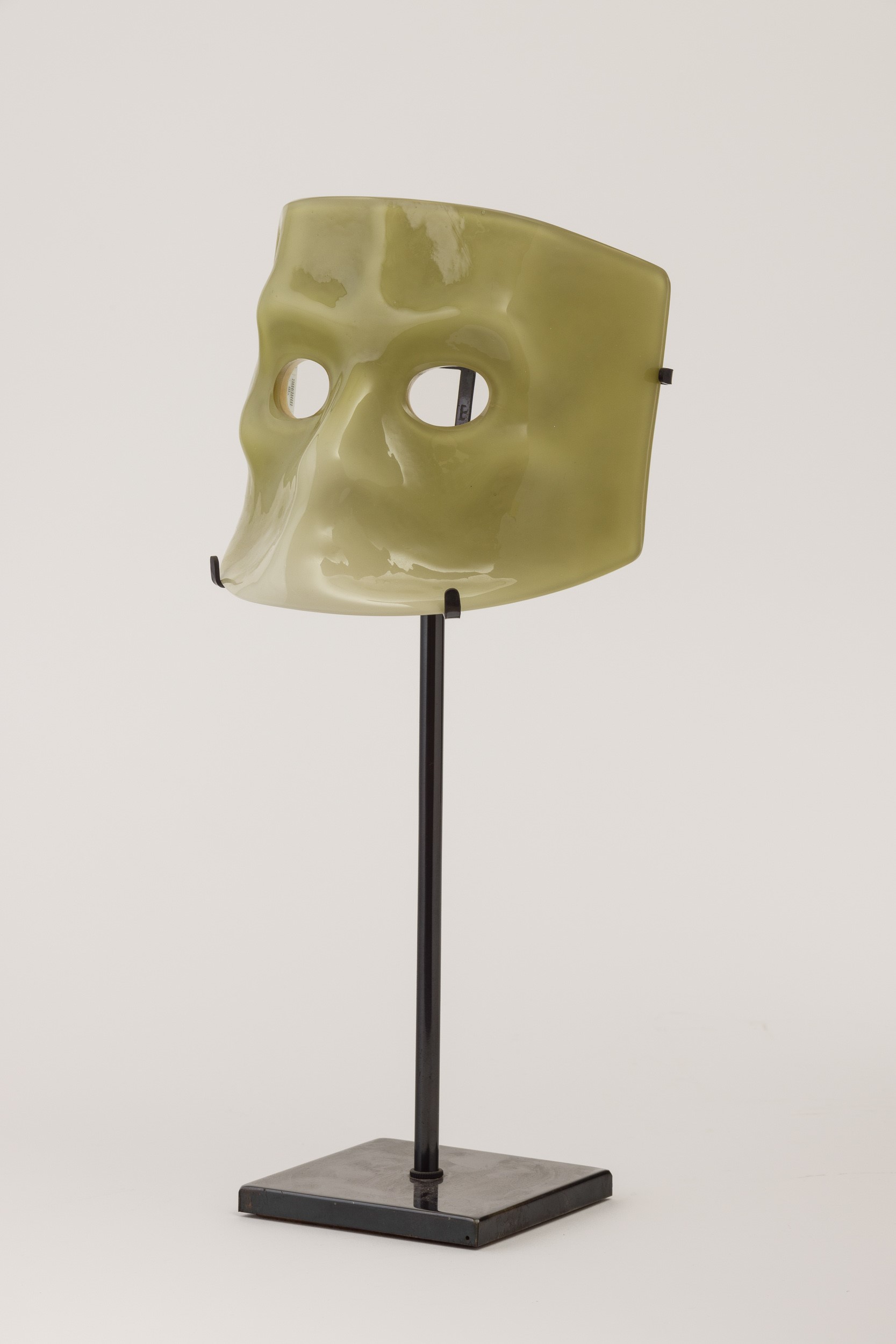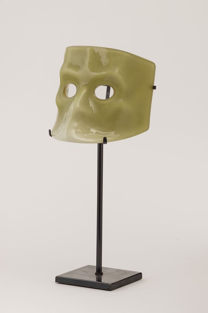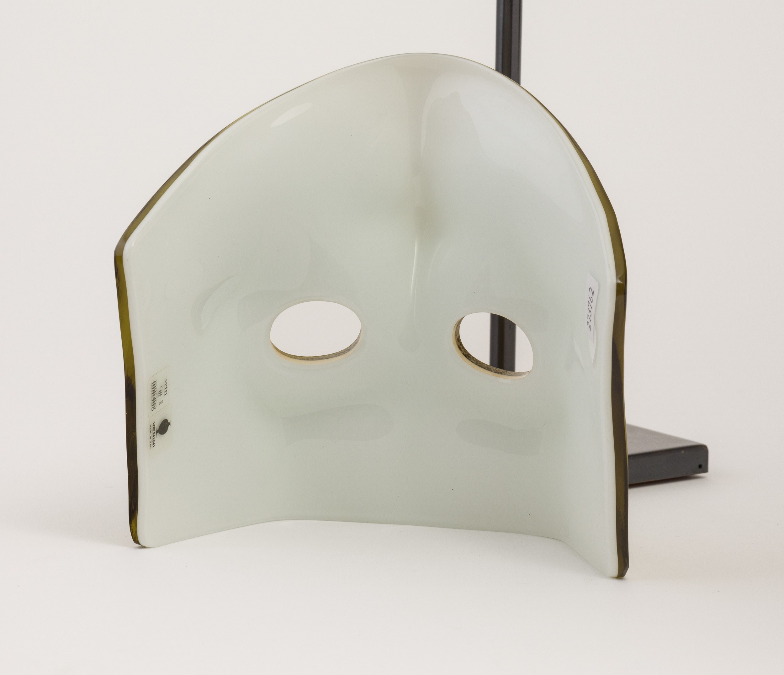 An opaline blown glass mask with an iron stand. Etched signature and old labels