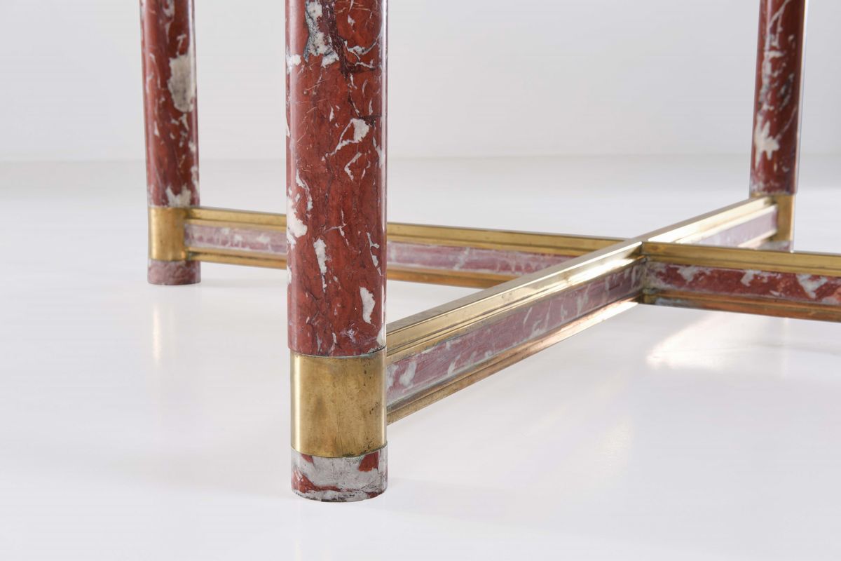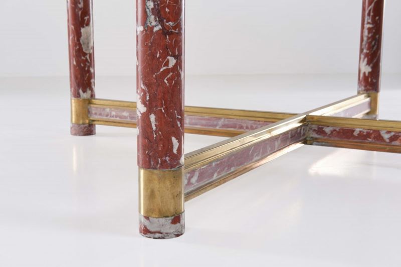 Struttura in legno e ottone con sostegni e rivestimenti in marmo rosso Francia. Piano in vetro.