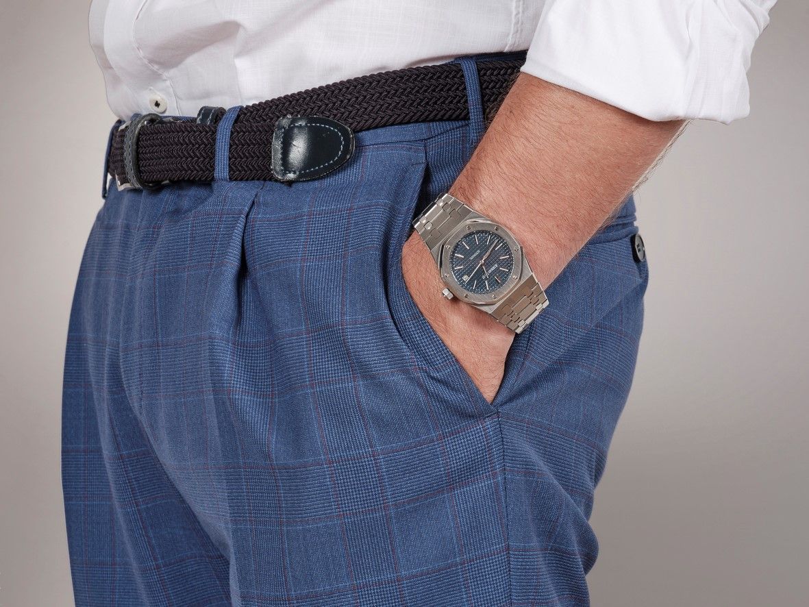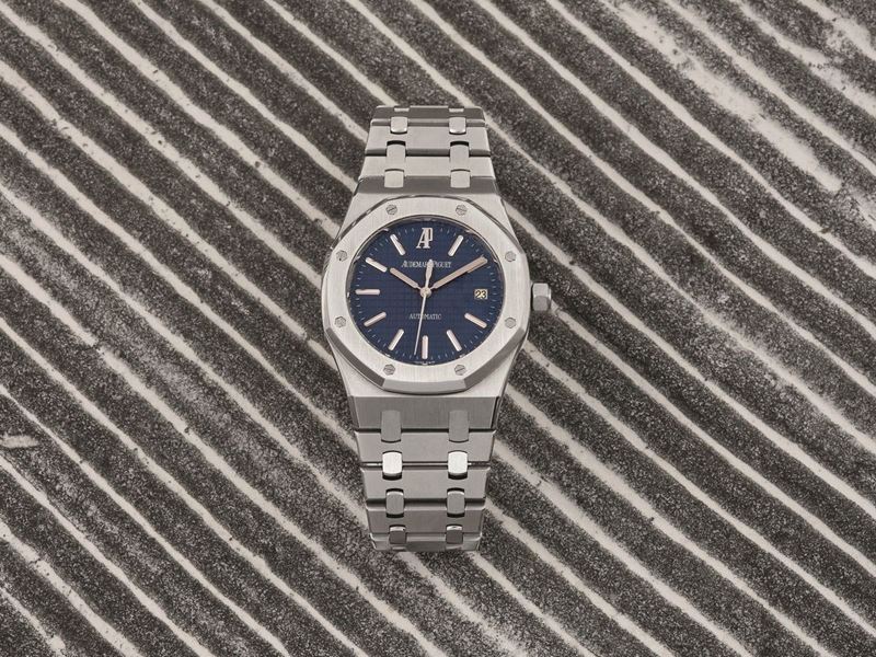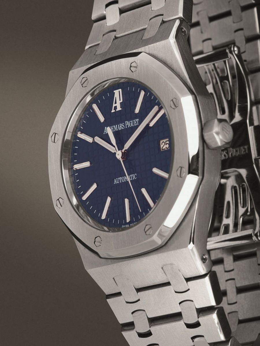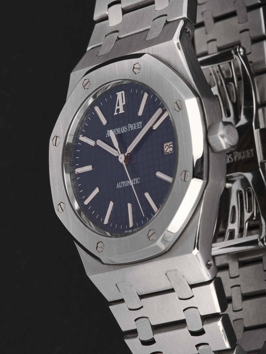 AUDEMARS PIGUET - Royal Oak Orologio a carica automatica in acciaio con quadrante blu lavorato con trama “grande tapisserie”, [..]