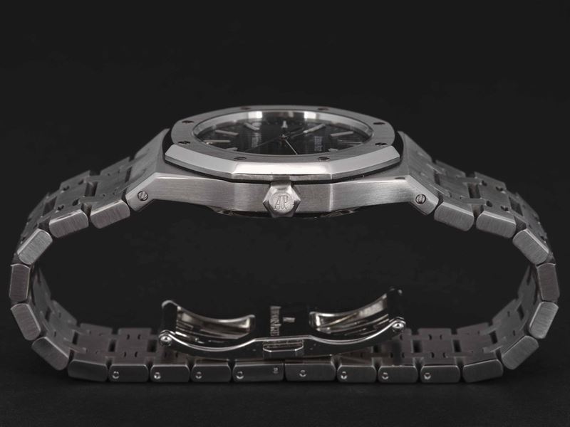 Indici a bastone con luminescenza. Presente a ore 12 il logo applicato Audemars Piguet. Cassa impermeabile con lunetta e fondello a forma ottagonale. Vetro zaffiro con calibro a vista.
