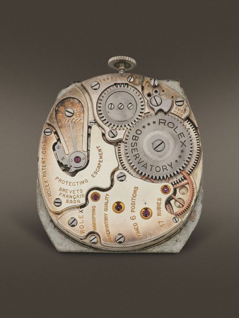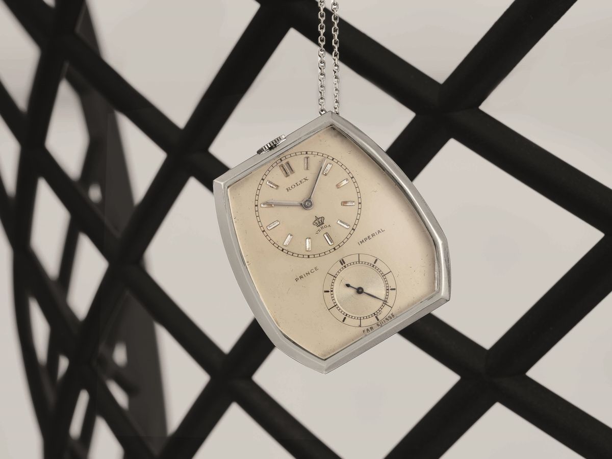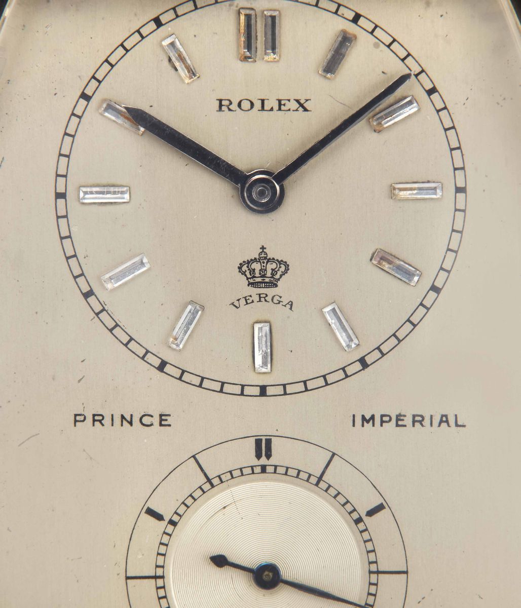 Spesso ci si dimentica delle tante meraviglie prodotte da Rolex prima dell'avvento dei cosiddetti "professionali", che hanno plasmato l'identità della maison in maniera decisiva. Il Prince Imperial incarna perfettamente il gusto anni '30 e, ad oggi, costituisce un oggetto di grande rarità e valore collezionistico. Prodotto prevalentemente come normale segnatempo da tasca, pochi esemplari presentano una particolare forma esagonale, di cui il nostro esemplare, che riporta referenza 1586, rappresenta una delle configurazioni meglio conservate e più affascinanti mai apparse sul mercato. La cassa in oro bianco si presenta in ottima stato e riporta sul fondello interno il punzone del suo cassaio, il celebre Robert Meylan. Se il design e le condizioni della cassa sono un unicum, il quadrante sarebbe in grado di meravigliare anche il collezionista più navigato. Un layout probabilmente unico, che colpisce per la pulizia estetica e l'inusuale distribuzione delle indicazioni. Tuttavia l'unicità ed il prestigio dell'orologio sono racchiuse nell'abbinamento fra la prestigiosa firma del concessionario milanese Verga e gli indici in diamante taglio baguette.