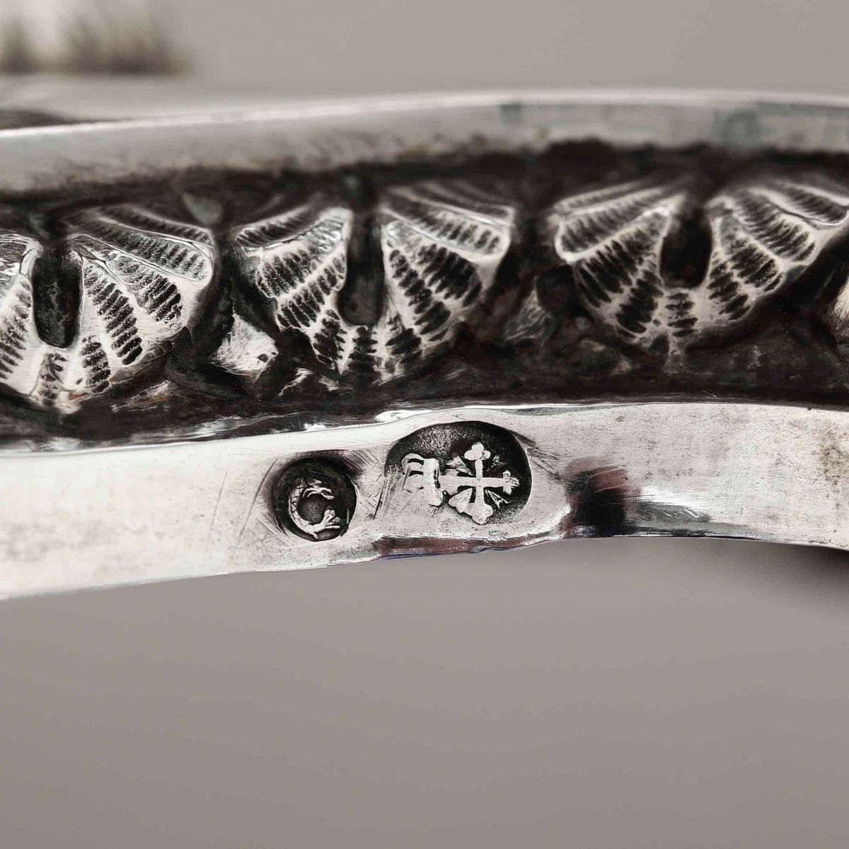 Acetoliera. Argento fuso e sagomato. Genova XIX secolo, marchi con delfino e croce mauriziana in uso dal 1825 al 1872