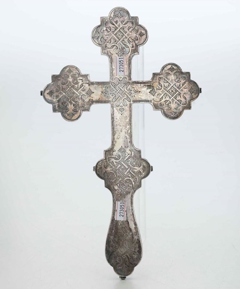 Croce benedizionale. Argento fuso, sbalzato, cesellato e dorato. Russia XIX secolo