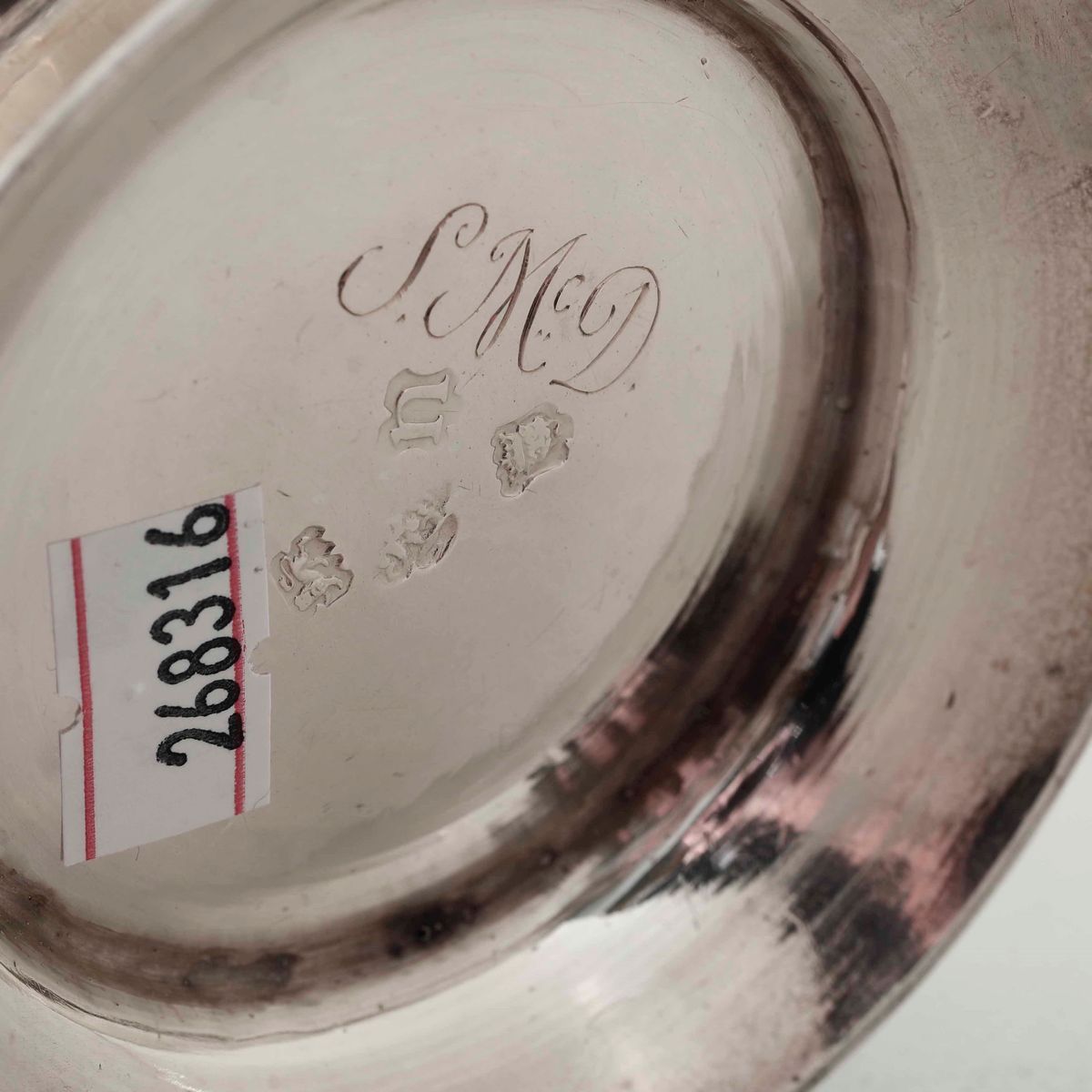 Mug in argento fuso, sbalzato e cesellato. Marchio della città di Londra per l'anno 1748, argentiere probabilmente John Robinson (bollo consunto di difficile lettura)