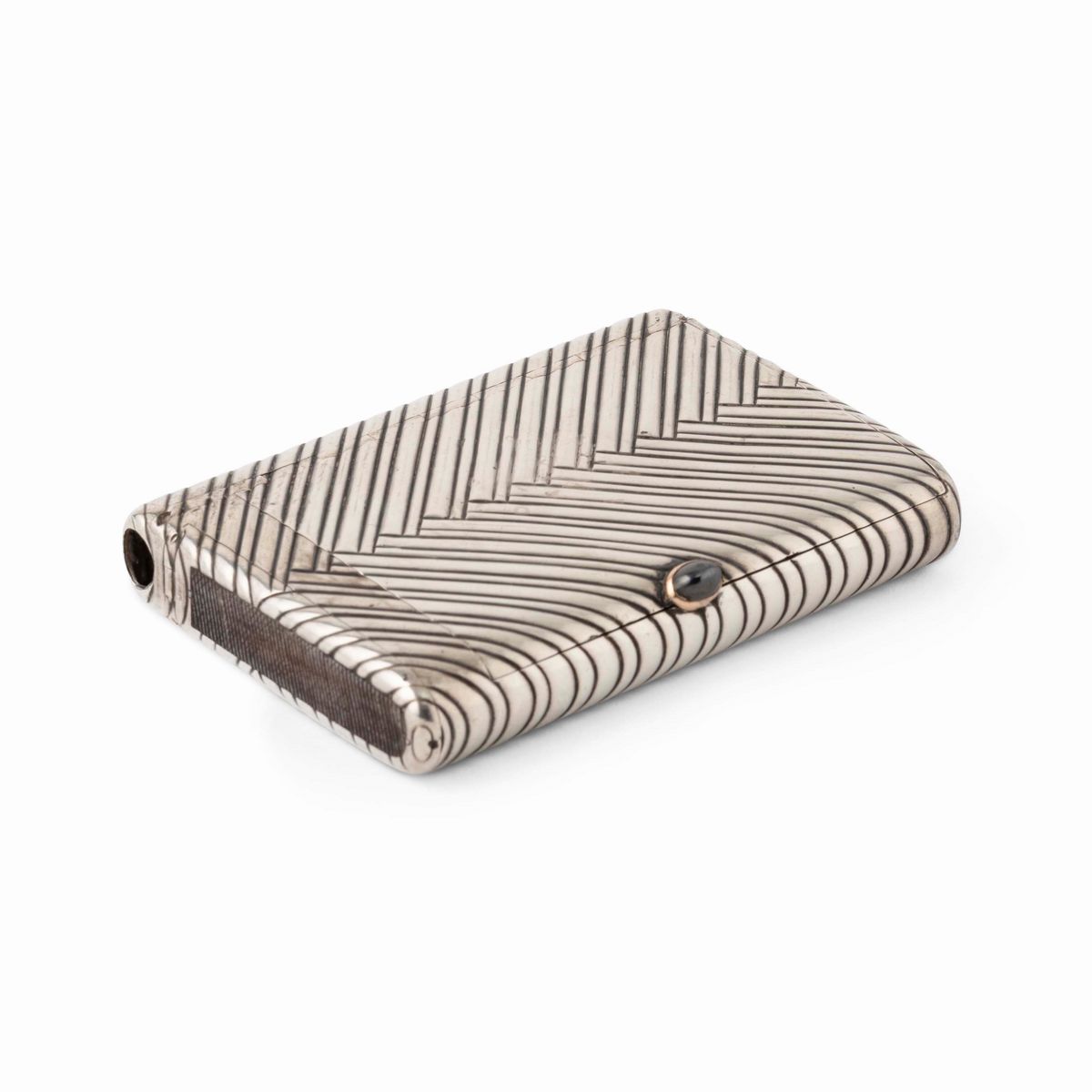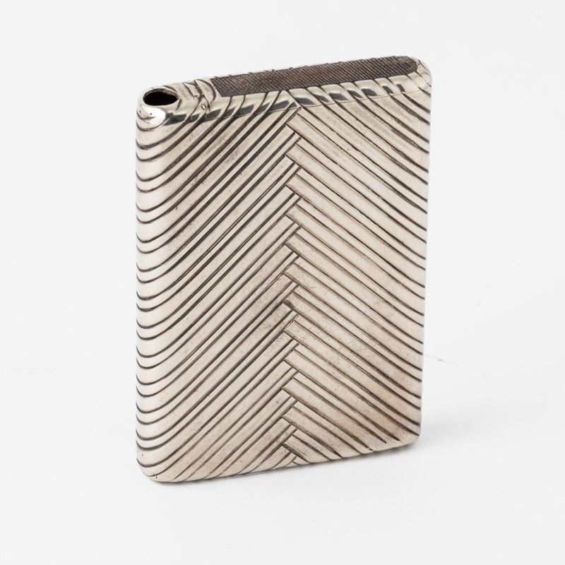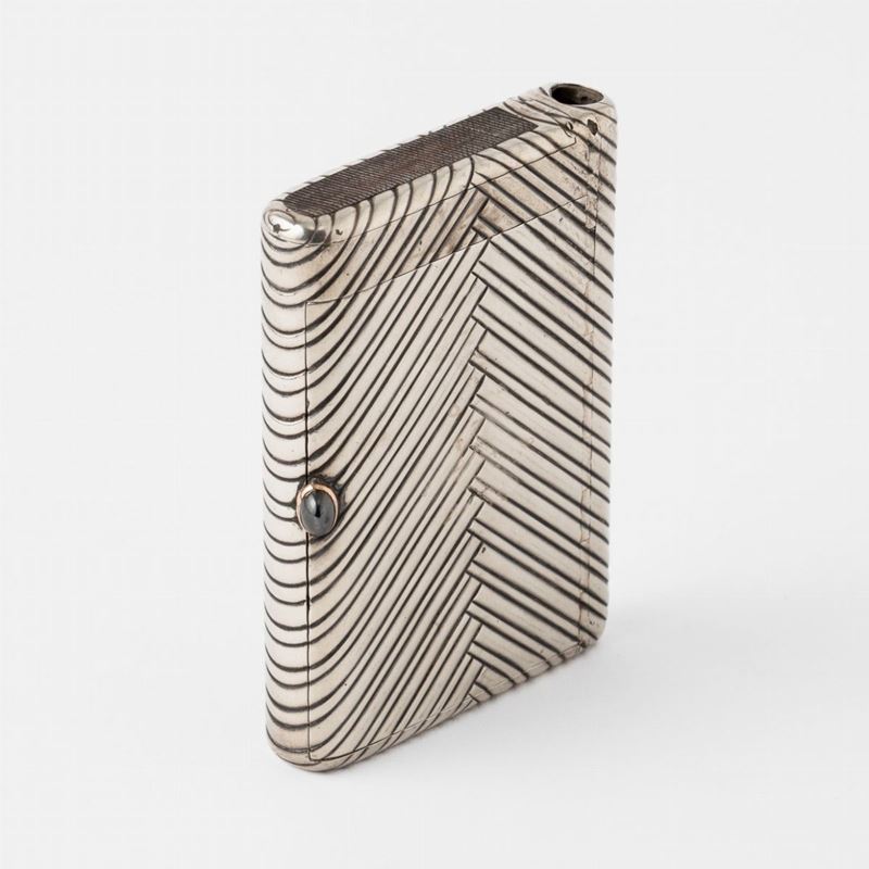 Porta sigarette e porta fiammiferi con cerniera a scomparsa. Argento fuso e cesellato a motivi geometrici e interno dorato. [..]